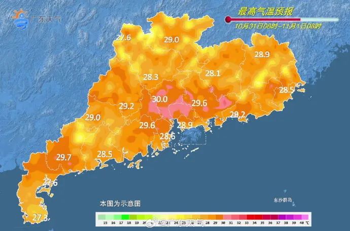 10月31日到11月1日,全省大部分市縣晴天,部分市縣早晨有輕霧。最低氣溫:粵北和珠江三角洲北部市縣15~18℃,其余大部分市縣18~21℃。