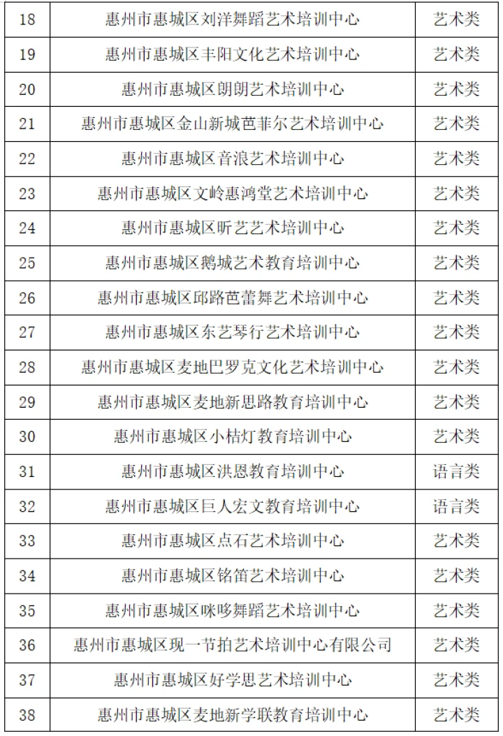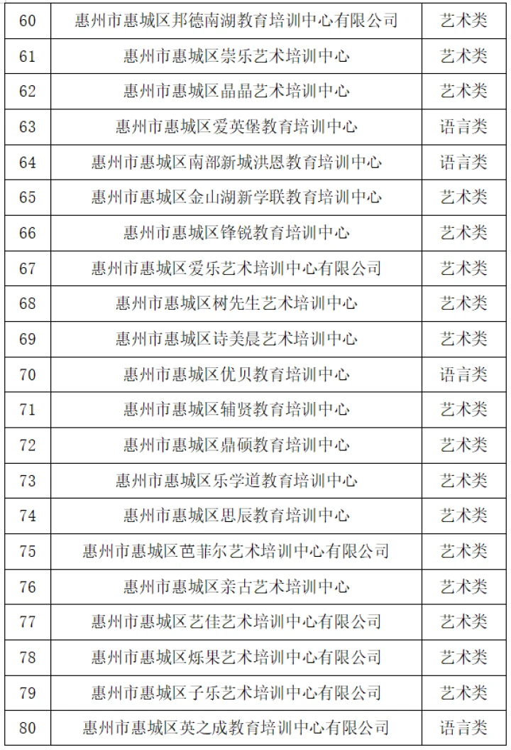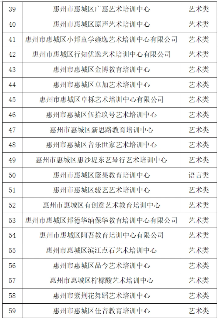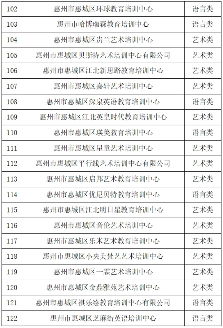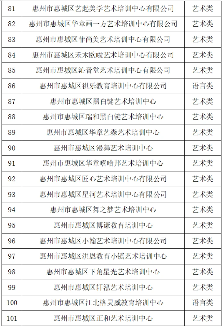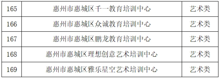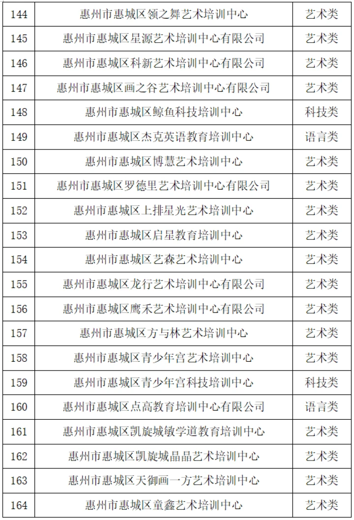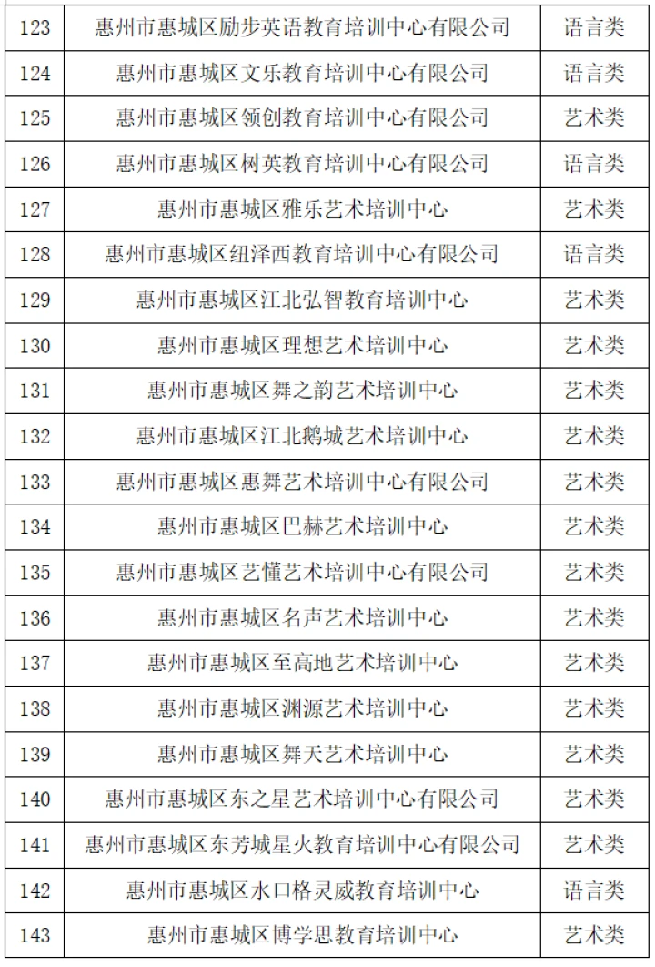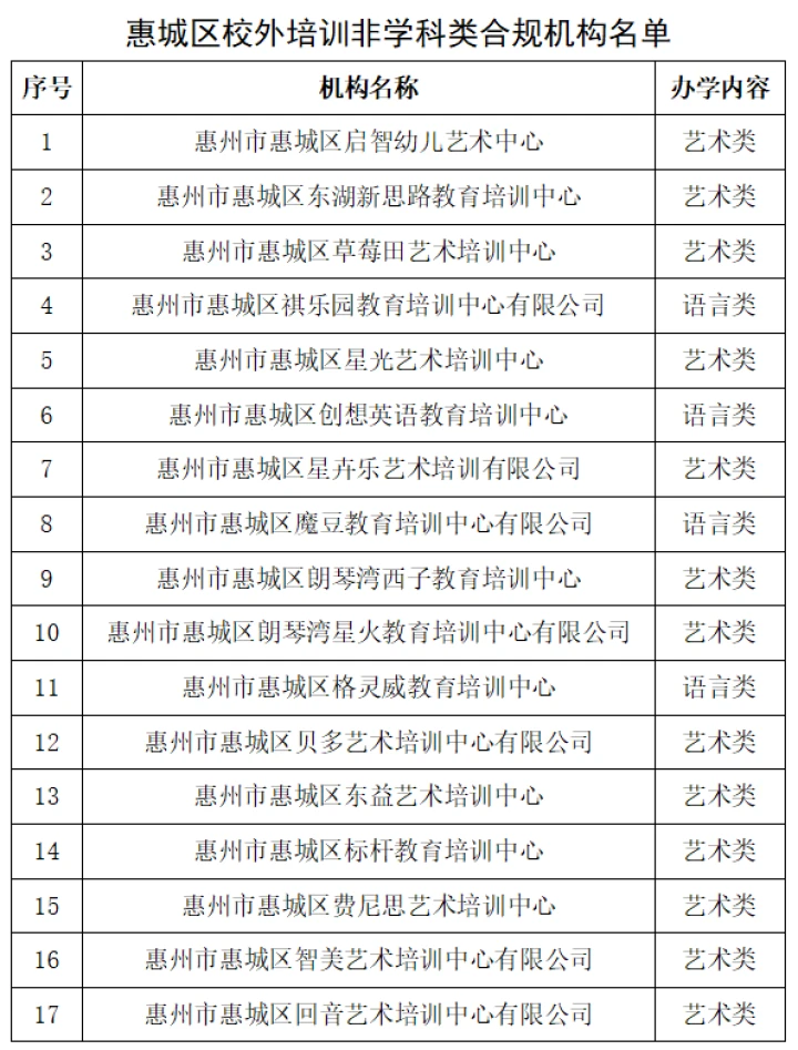 10月26日,惠城區(qū)教育局發(fā)布“關(guān)于惠城區(qū)非學(xué)科類校外培訓(xùn)機(jī)構(gòu)辦理辦學(xué)許可證的情況通報(bào)”(以下簡(jiǎn)稱“通報(bào)”),公布惠城區(qū)獲得辦學(xué)許可證的非學(xué)科類校外培訓(xùn)機(jī)構(gòu)名單,截至2023年10月25日,惠城區(qū)合規(guī)非學(xué)科類校外培訓(xùn)機(jī)構(gòu)共有169所。