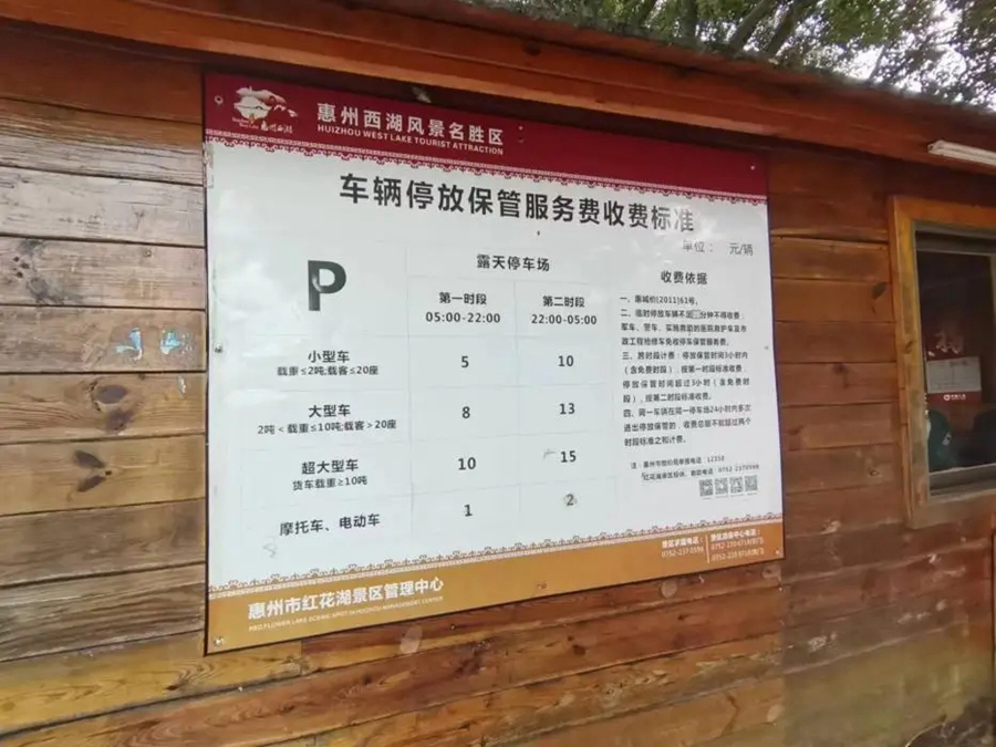 隨后,記者來到惠泊車合作的另一個停車場——豐山公園附近的豐山停車場,從標識牌可見,該停車場雖由惠州交投智慧停車投資有限公司(簡稱智停公司)管理,但收費主體為惠州市西湖景區(qū)管理中心,計費標準也有所不同。