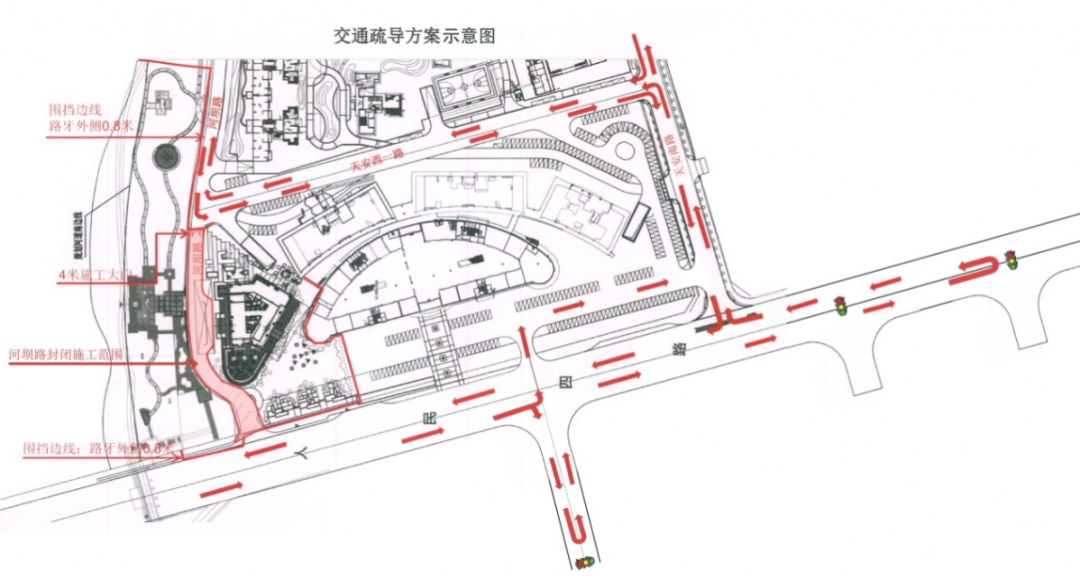 二、臨時(shí)交通管制方案:施工期間,河壩路局部道路(人民四路至天安西一路區(qū)間路段)實(shí)施全封閉施工,過往車輛建議繞行天安南路(見下圖)。
