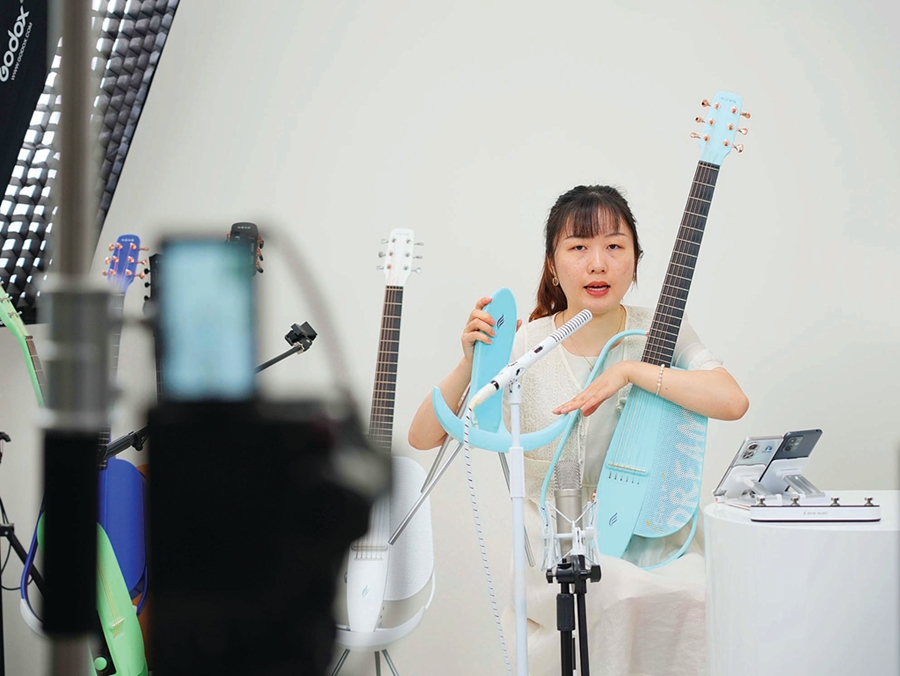 “刮風(fēng)這天,我試過握著你手,但偏偏,雨漸漸,大到我看你不見……”11月9日,在惠州市恩雅樂器有限公司直播間,一名女主播正撥動琴弦,唱起了周杰倫的《晴天》。她告訴記者,這是公司最新款的智能電吉他,配了無線話筒,可以一邊彈一邊K歌。