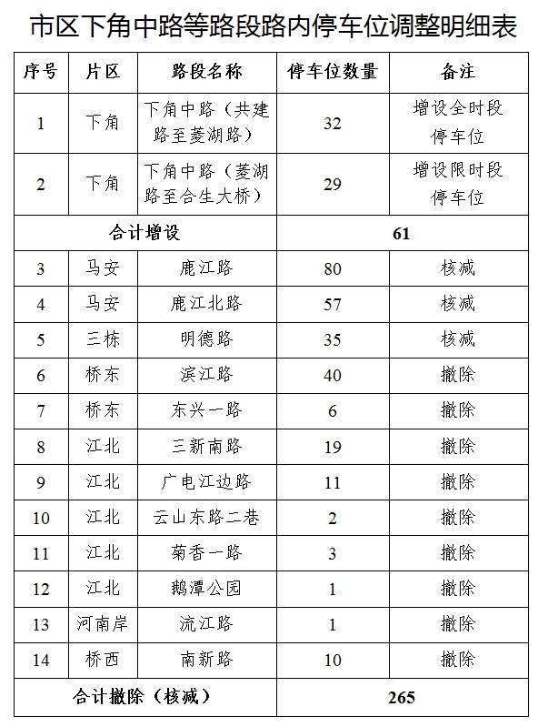 其中,規(guī)范設(shè)置下角片區(qū)下角中路等2條路段61個(gè)停車(chē)位,下角中路共建路至菱湖路段增設(shè)32個(gè)全時(shí)段停車(chē)位,下角中路菱湖路至合生大橋段增設(shè)限時(shí)停車(chē)位29個(gè);撤除(核減)馬安片區(qū)鹿江路等12條路段所設(shè)265個(gè)停車(chē)位。馬安鹿江路、鹿江北路核減137個(gè)停車(chē)位,三棟明德路核減35個(gè)停車(chē)位,橋東濱江路、東興一路撤除46個(gè)停車(chē)位,江北三新南路、廣電江邊路、菊香一路、鵝潭公園撤除34個(gè)停車(chē)位,河南岸流江路撤除1個(gè)停車(chē)位,橋西南新路撤除10個(gè)停車(chē)位。