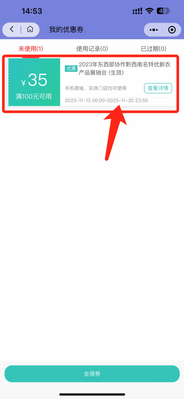 5.在我的優(yōu)惠券內(nèi),即可查看優(yōu)惠券詳情信息