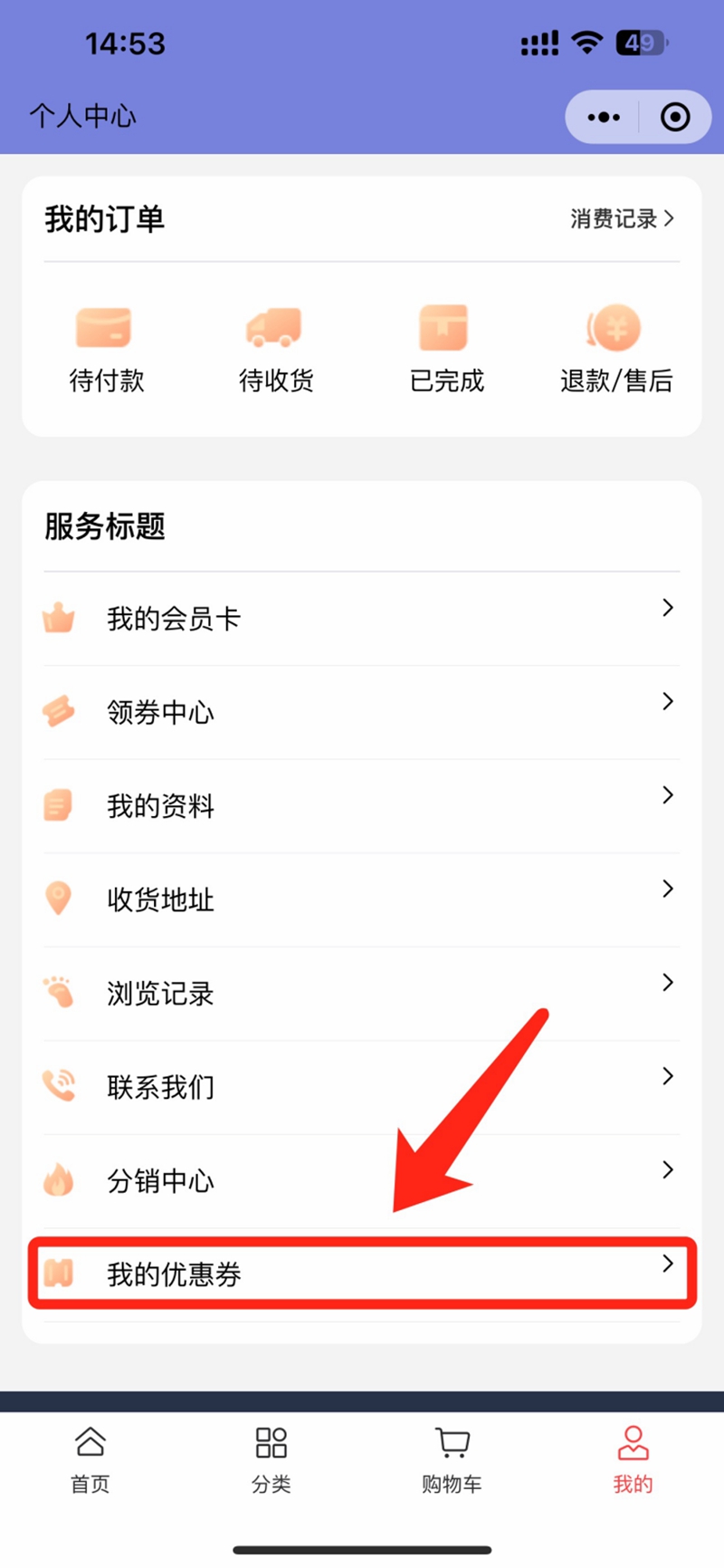 4.找到“我的優(yōu)惠券”即可進入消費券頁面