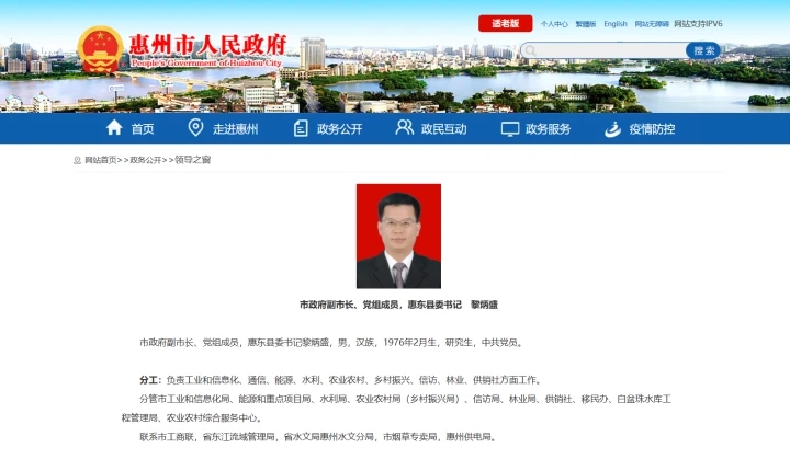 惠州市政府副市長、黨組成員,惠東縣委書記黎炳盛,男,漢族,1976年2月生,研究生,中共黨員。
