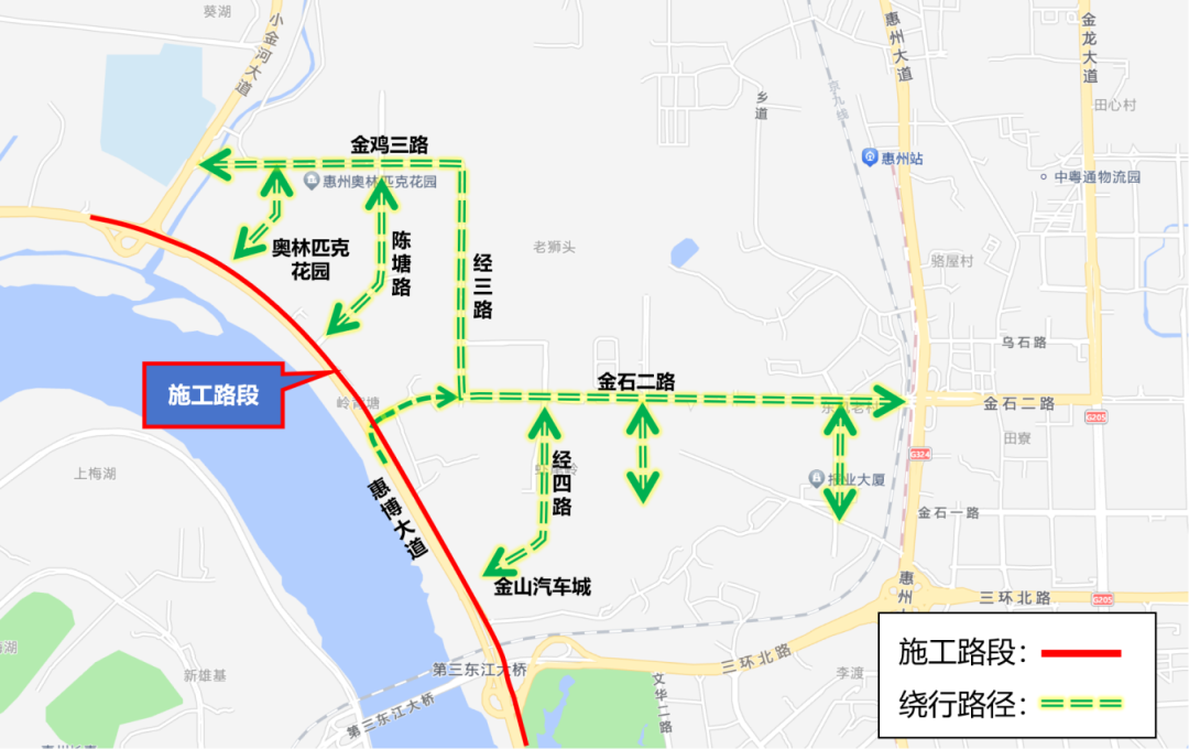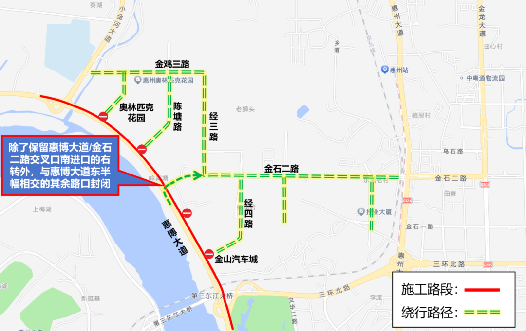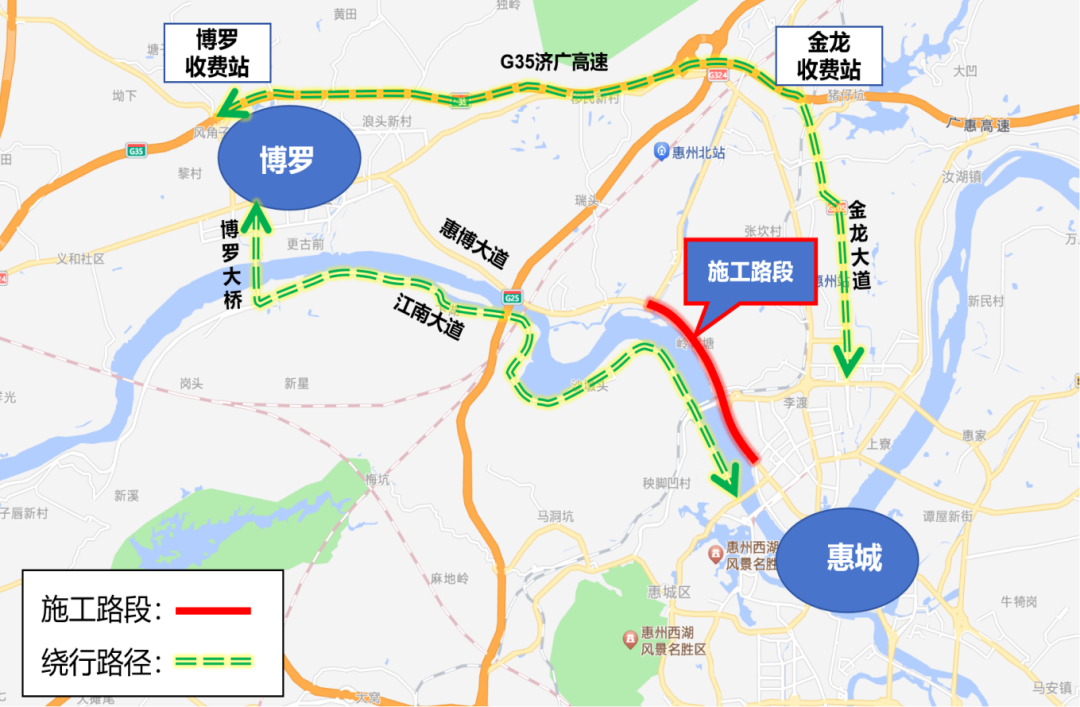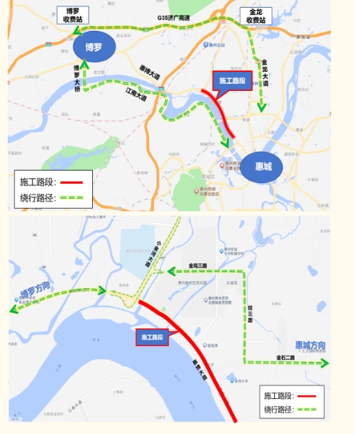 通過江南大道(超限車輛除外)或G35濟(jì)廣高速公路(博羅收費(fèi)站-金龍收費(fèi)站)繞行;或通過小金河大道立交,從金雞三路、經(jīng)三路、金石二路等道路繞行。