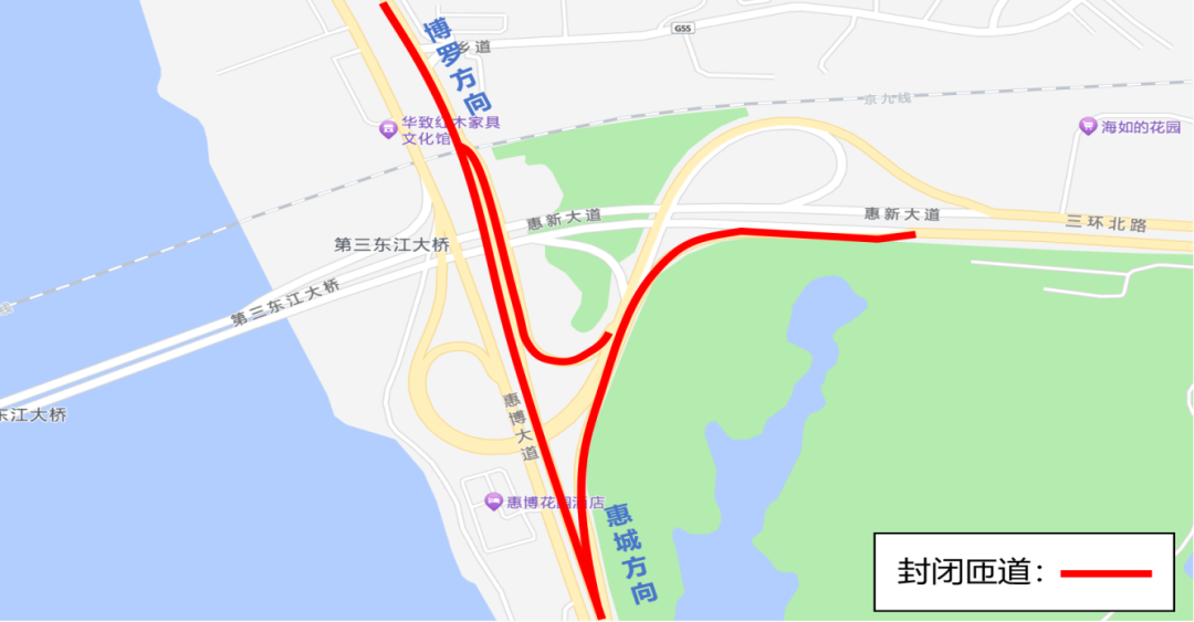 。ǘ┠径蘸⒔唬喝h(huán)北路往惠博大道東半幅的出口匝道及惠博大道東半幅往三環(huán)北路的進(jìn)口匝道封閉,其余匝道放通。