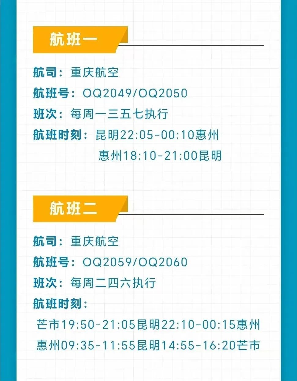 2023年11月26日起,重慶航空將開通惠州直飛昆明的航線,每周一、三、五、七執(zhí)行。并于2023年11月28日起,開通惠州飛昆明再飛芒市的航線,每周二、四、六執(zhí)行。