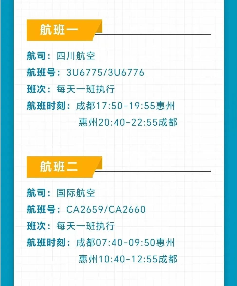 2024年1月26日起,四川航空將恢復(fù)惠州直飛成都天府航線,每天1班執(zhí)行;謴(fù)后,惠州機(jī)場通往成都航班將由現(xiàn)在的每天1班,增加至每天2班。