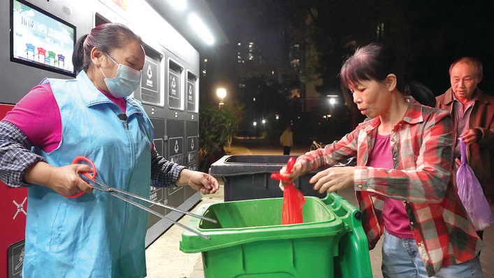 保潔員桶邊值守引導(dǎo)業(yè)主分類投放垃圾。 惠州日?qǐng)?bào)記者楊建業(yè) 攝