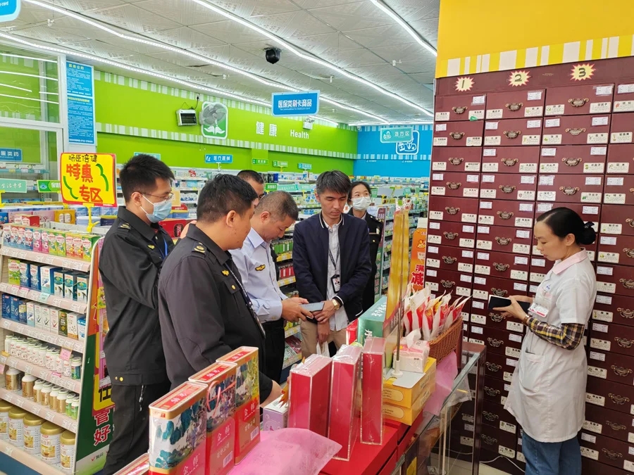 惠州市市場(chǎng)監(jiān)督管理局與惠城區(qū)市場(chǎng)監(jiān)督管理局的執(zhí)法人員對(duì)藥店開展專項(xiàng)檢查。