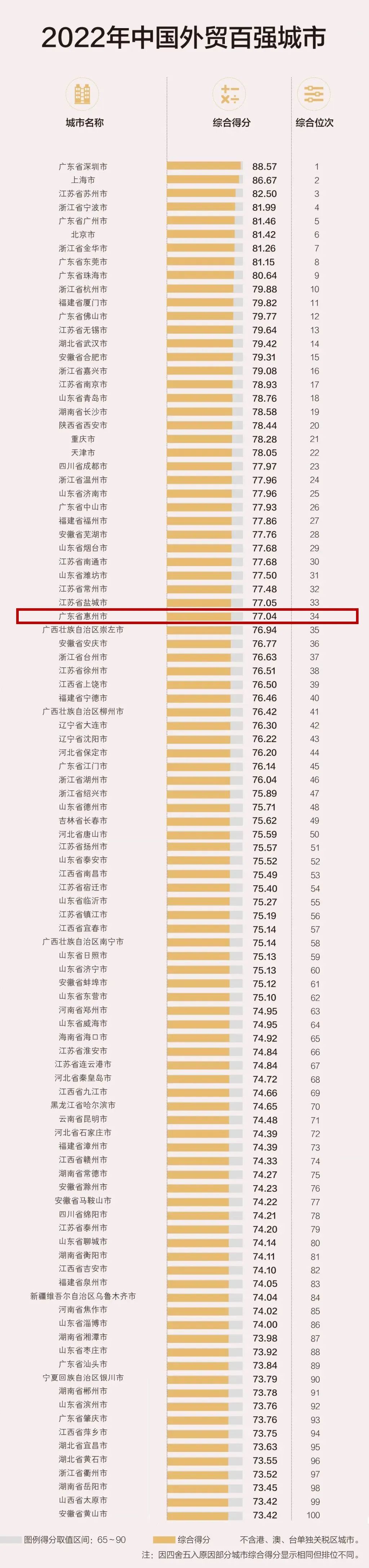 近日,《中國(guó)海關(guān)》雜志發(fā)布2022年中國(guó)城市外貿(mào)競(jìng)爭(zhēng)力報(bào)告,廣東10個(gè)城市入選2022年中國(guó)外貿(mào)百?gòu)?qiáng)城市名單,包括深圳、廣州、東莞、珠海、佛山、中山、惠州、江門、汕頭、肇慶。其中深圳位居榜首、惠州位列第34位。