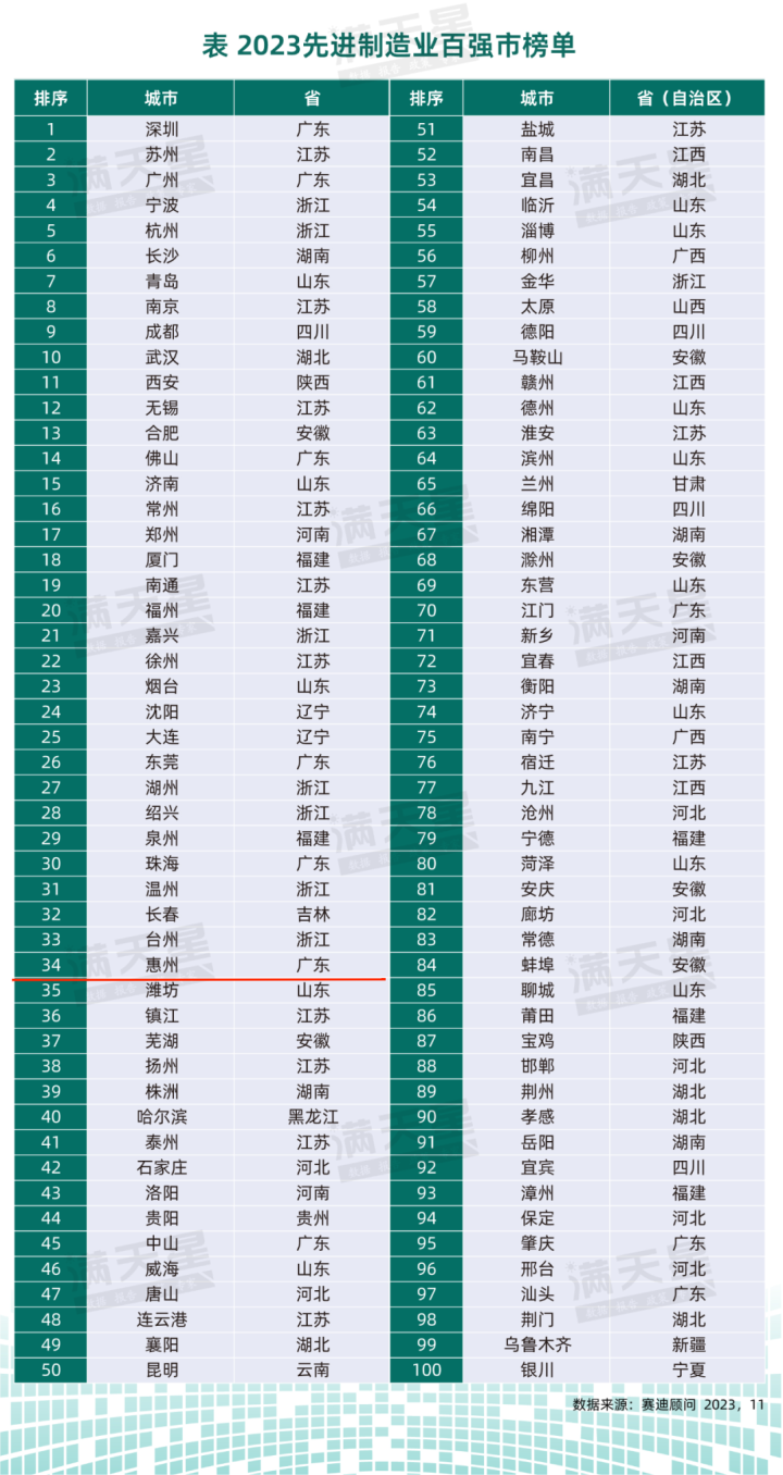 11月24日,在2023先進(jìn)制造業(yè)發(fā)展大會(huì)上,工業(yè)和信息化部中國(guó)電子信息產(chǎn)業(yè)發(fā)展研究院下屬的賽迪顧問(wèn)發(fā)布了《2023先進(jìn)制造業(yè)城市研究報(bào)告》,公布2023先進(jìn)制造業(yè)百?gòu)?qiáng)市榜單,惠州上榜2023先進(jìn)制造業(yè)百?gòu)?qiáng)市,排名全國(guó)第34位。