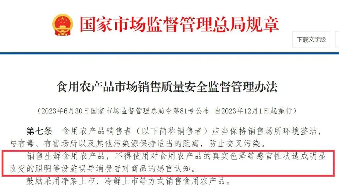 對于群眾反映“生鮮燈”誤導(dǎo)消費者問題,國家市場監(jiān)管總局7月22日發(fā)布的《食用農(nóng)產(chǎn)品市場銷售質(zhì)量安全監(jiān)督管理辦法》(以下簡稱“《辦法》”)有了明確的規(guī)定:“銷售生鮮食用農(nóng)產(chǎn)品,不得使用對食用農(nóng)產(chǎn)品的真實色澤等感官性狀造成明顯改變的照明等設(shè)施誤導(dǎo)消費者對商品的感官認(rèn)知!薄掇k法》將于今年12月1日起施行。