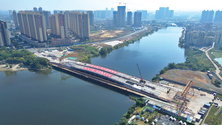 金山湖一號橋項(xiàng)目主體鋼箱梁合龍現(xiàn)場;葜萑請(bào)記者羅劍業(yè) 攝