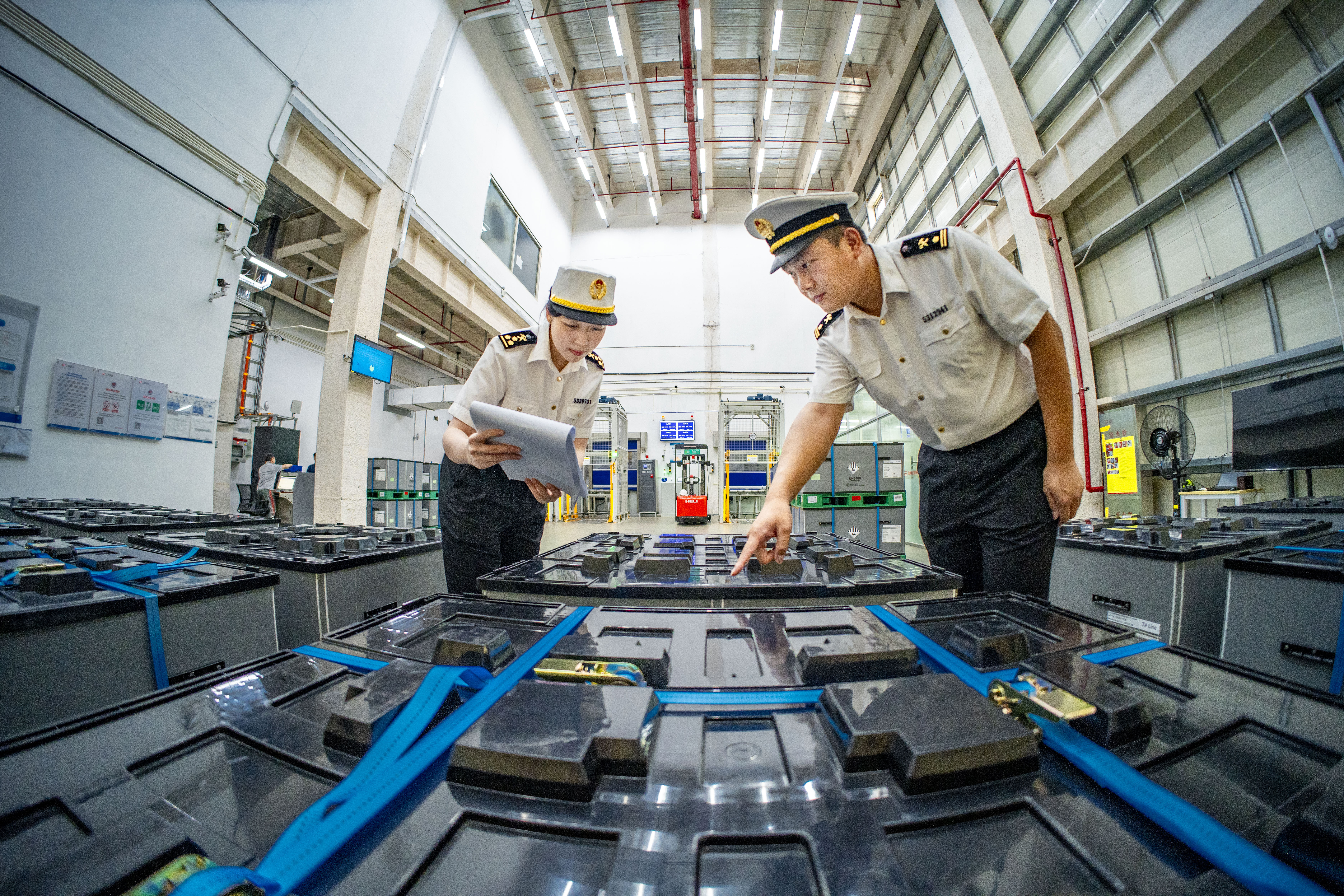惠州海關(guān)關(guān)員在轄區(qū)鋰電池生產(chǎn)企業(yè)進行現(xiàn)場查檢;葜萑請笥浾邉槦 通訊員張仕榮 攝