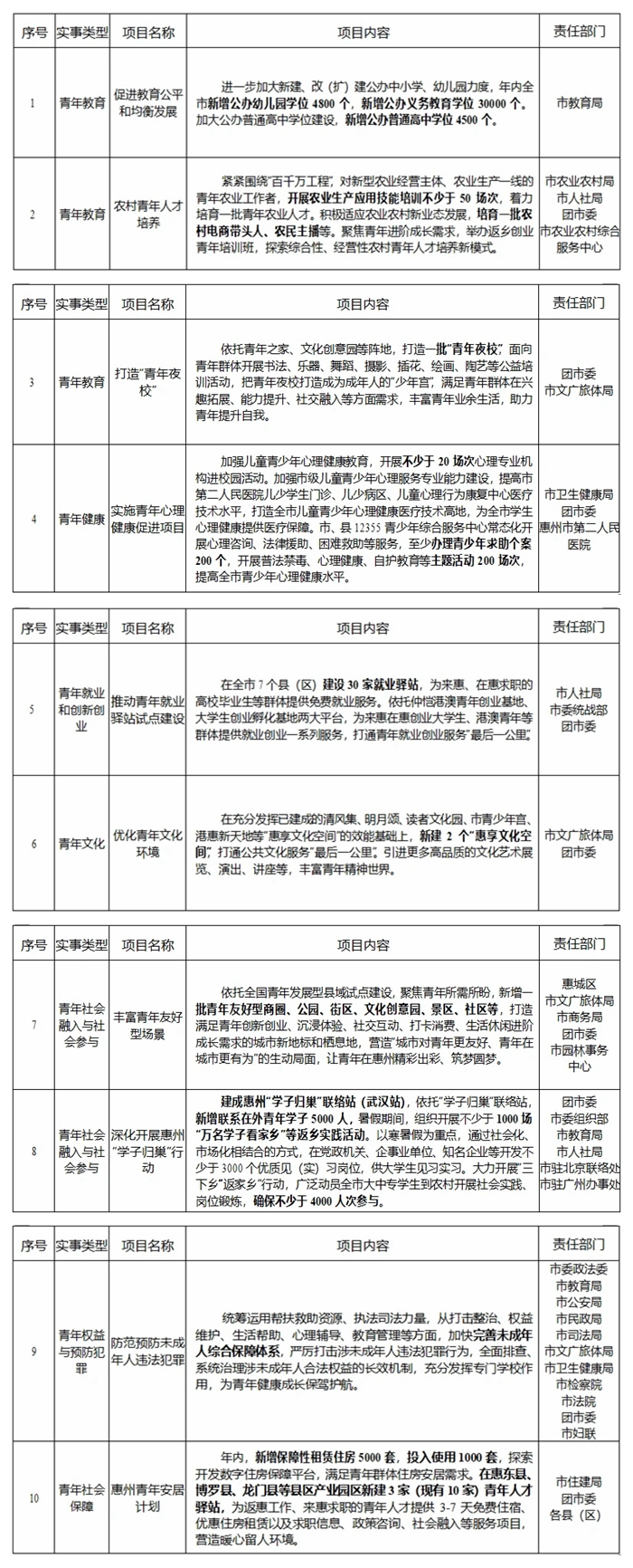 2024年惠州青年民生實(shí)事發(fā)布,分5大類10小項(xiàng)重點(diǎn)項(xiàng)目