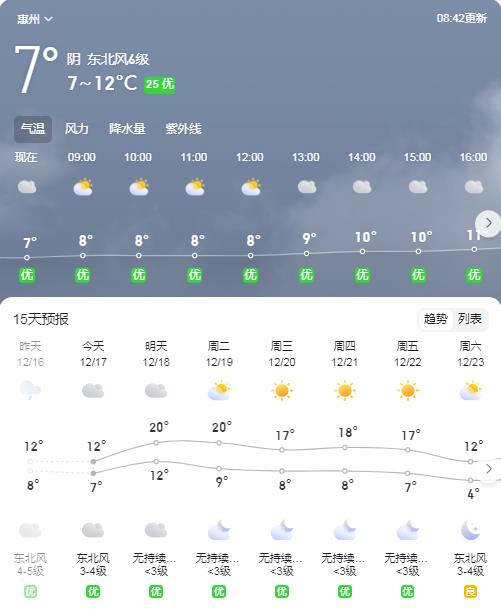 惠州市氣象臺發(fā)布稱,預計12月17日我市受寒潮影響,北風加大,陰天,局部有小雨,最低氣溫北部和東部山區(qū)4~6℃,其余地區(qū)7~9℃,最高氣溫10~13℃;18日,多云間陰天,氣溫回升;19日,受弱冷空氣影響,北風再次加大,陰天到多云,局部有小雨,白天氣溫略降;20日起,冷空氣繼續(xù)補充影響,云量減少轉(zhuǎn)為晴朗干燥,北部和東部山區(qū)局部有霜凍,最低氣溫北部和東部山區(qū)3~5℃,其余地區(qū)6~8℃,最高氣溫14~17℃。