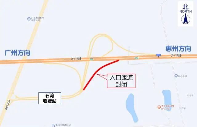 2023年12月16日22:00至次日07:00,以及2023年12月17日22:00至次日07:00,G35濟(jì)廣高速公路西往東(廣州往惠州)方向石灣收費(fèi)站入口匝道封閉施工(見圖1),石灣上高速往惠州方向的車輛可繞行石灣大道、國道G324至園洲收費(fèi)站上高速。