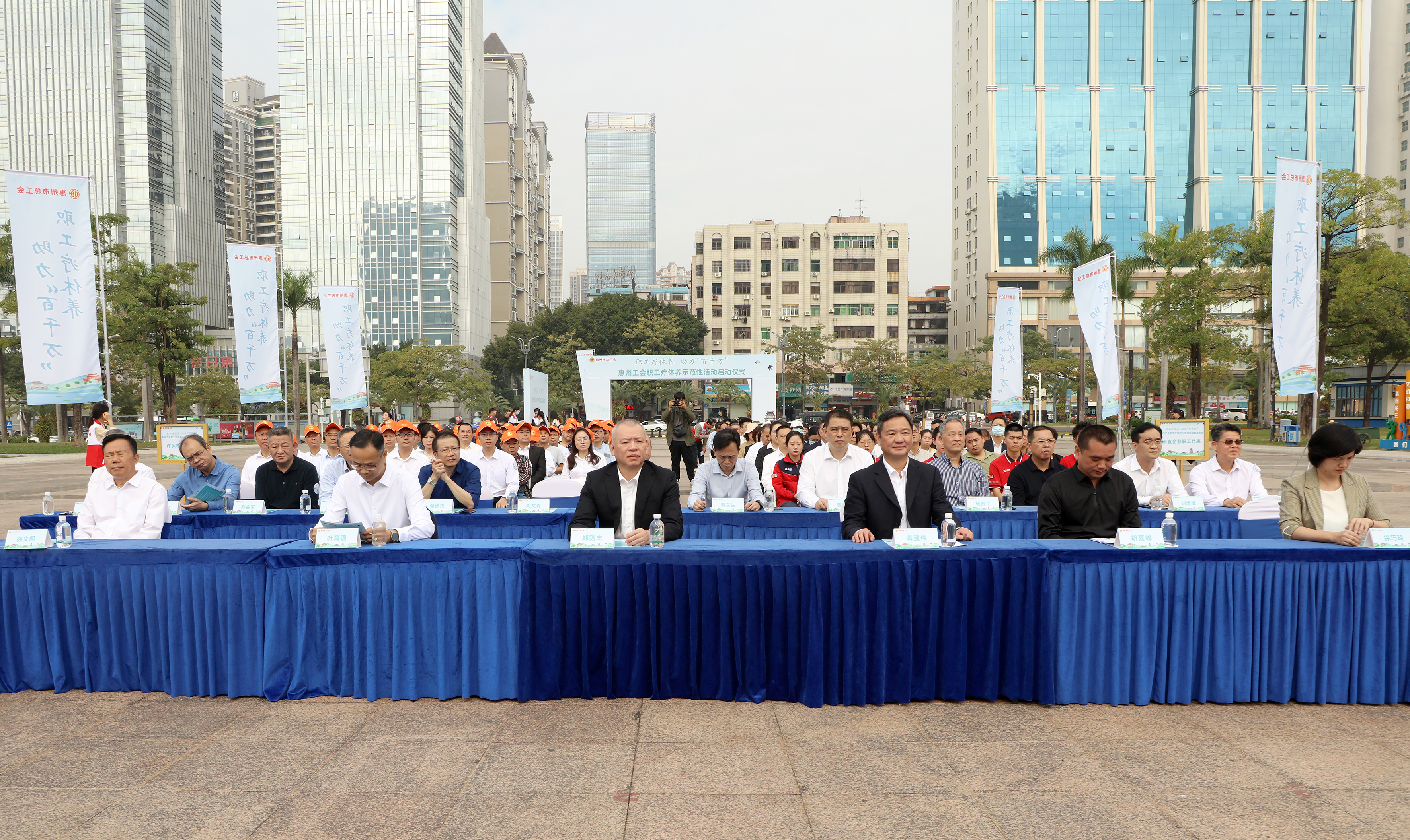 當(dāng)天,冬日的惠州依然溫暖,在市區(qū)江北體育館廣場(chǎng)前,百余名一線(xiàn)職工相聚,共同慶;葜莨(huì)職工鄉(xiāng)村療休養(yǎng)示范性活動(dòng)啟動(dòng)。