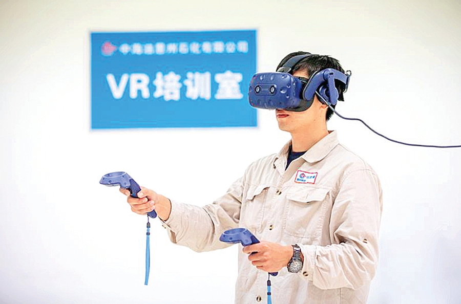 中海油惠州石化學(xué)員使用VR眼鏡接受安全培訓(xùn);葜萑?qǐng)?bào)記者匡湘鄂 歐陽(yáng)德輝 通訊員王震攝