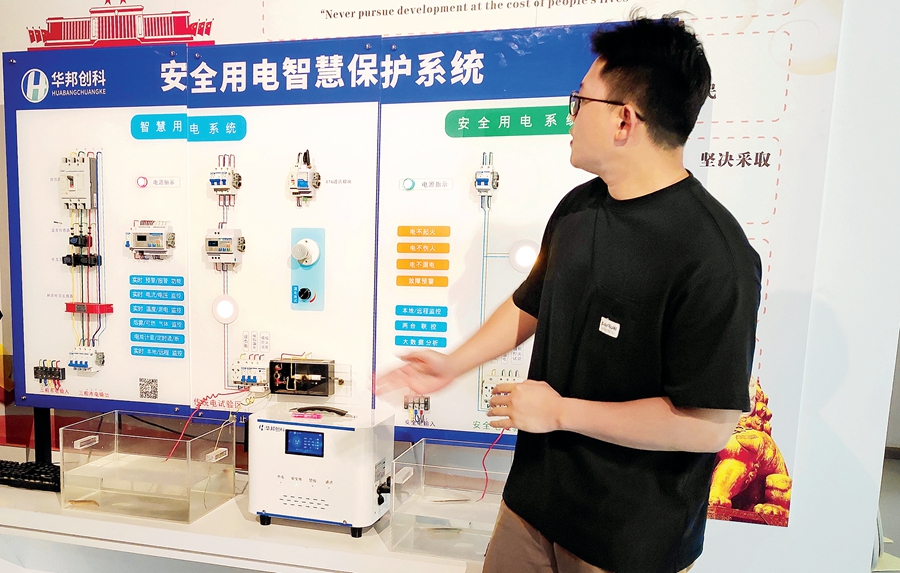 華邦創(chuàng)科首創(chuàng)研發(fā)“安全用電智慧保護(hù)系統(tǒng)”原理展示;葜萑?qǐng)?bào)記者侯縣軍 攝