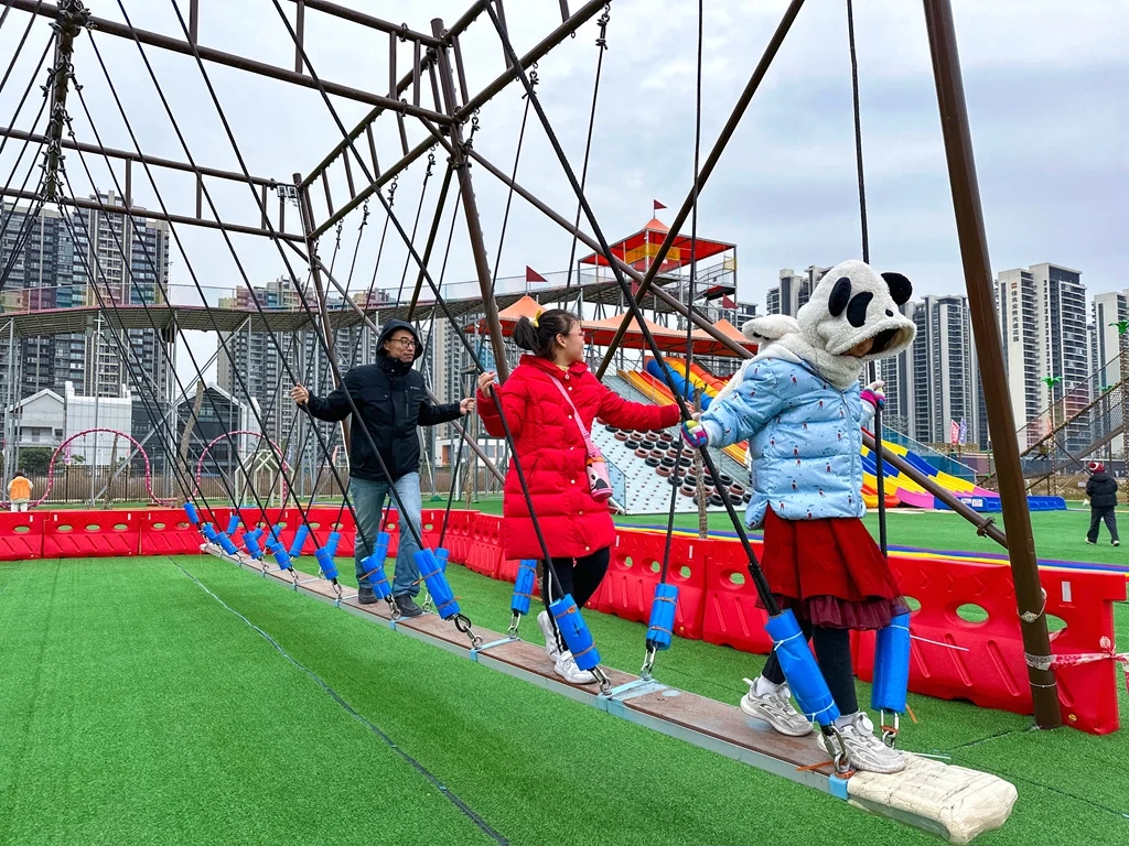 “快!我爬上來了,你也抓緊點!薄拔铱焐蟻砹,真是太好玩了!蹦Хǔ潜ず筒屎缁朗怯螛穲@的王牌項目,魔法城堡這個大體量戶外親子樂園項目由可自由組合的超大型無動力游樂設備組成,有蹦床、滑梯、天空步道等,充滿童趣和體驗感。彩虹滑道長約100米,在惠州同類項目中數(shù)一數(shù)二。