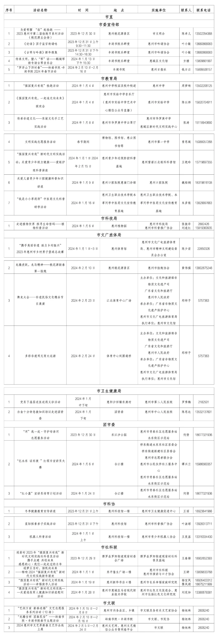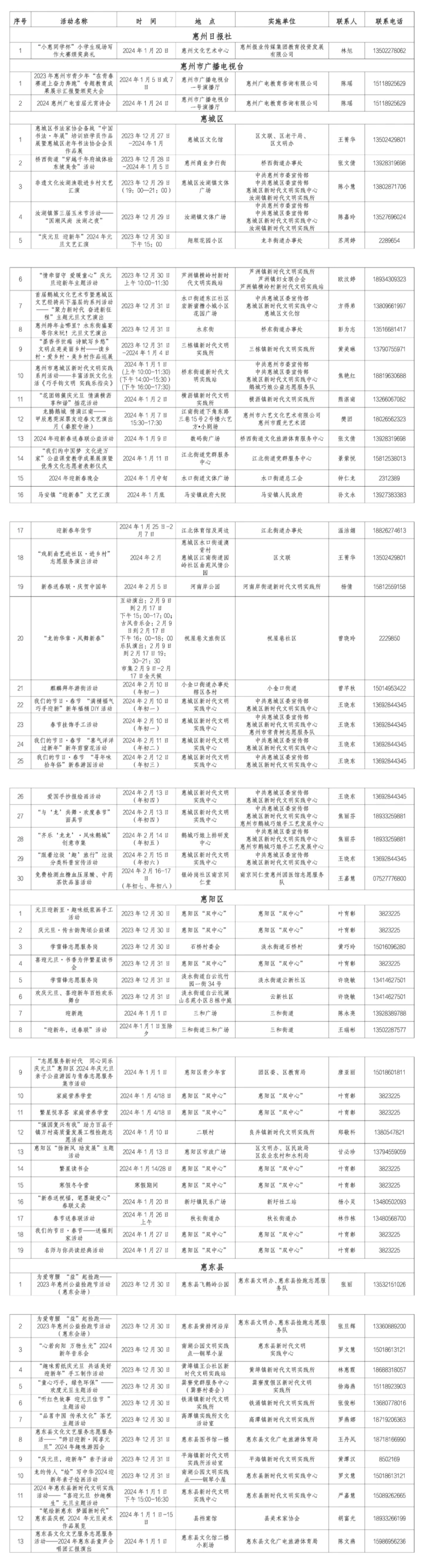 我們的節(jié)日·精神的家園、強(qiáng)國復(fù)興有我、愛國主義教育、節(jié)日送溫暖、公益撿跑、文化藝術(shù)、體育運動、勞動實踐等重點突出、內(nèi)容豐富、形式新穎、群眾喜聞樂見的各項活動精彩紛呈,喜慶熱鬧的新年氣息撲面而來。本系列活動深入貫徹落實中央、省市推進(jìn)精神文明建設(shè)高質(zhì)量發(fā)展的決策部署,進(jìn)一步推進(jìn)常態(tài)化開展新時代文明實踐活動工作,豐富惠州元旦春節(jié)期間文化生活。