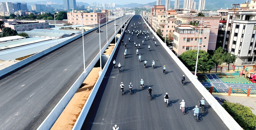 “紅色干線貫通騎行 共建良好營(yíng)商環(huán)境”騎行活動(dòng)日前在惠陽(yáng)區(qū)秋長(zhǎng)街道、新圩鎮(zhèn)同時(shí)舉行,騎行愛好者們疾馳在紅色干線的高架橋上。惠州日?qǐng)?bào)記者許文昌 攝