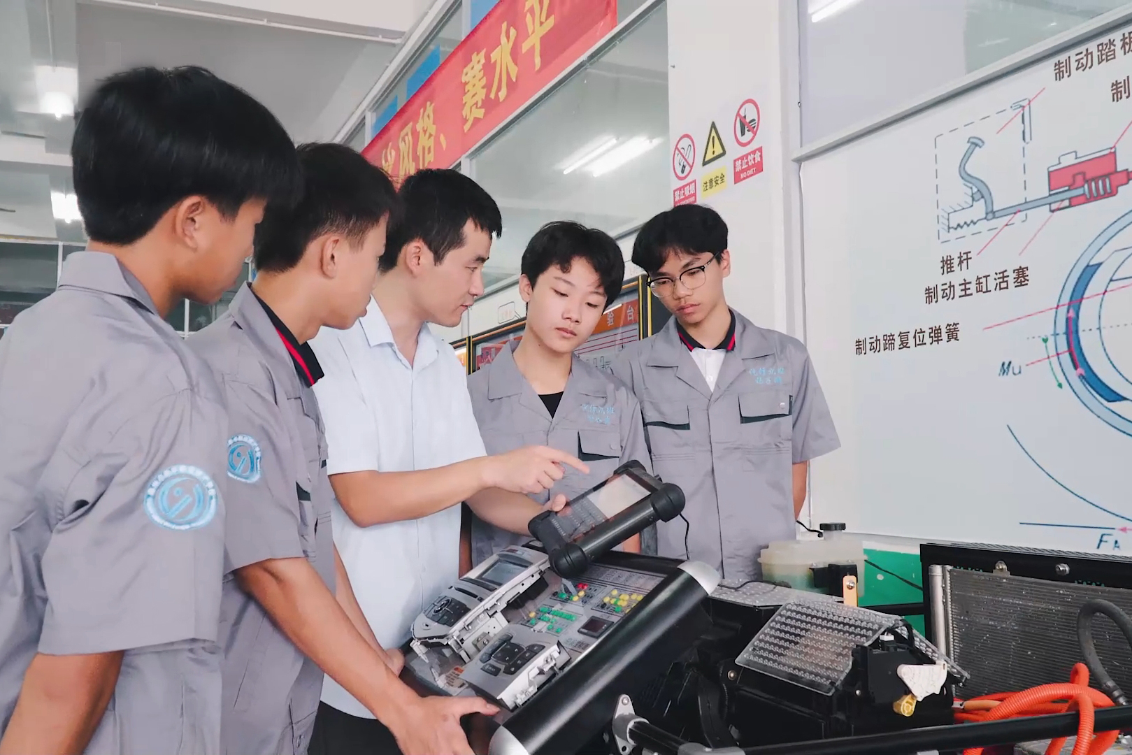 新能源汽車運(yùn)用與維修專業(yè)學(xué)生實(shí)訓(xùn)。