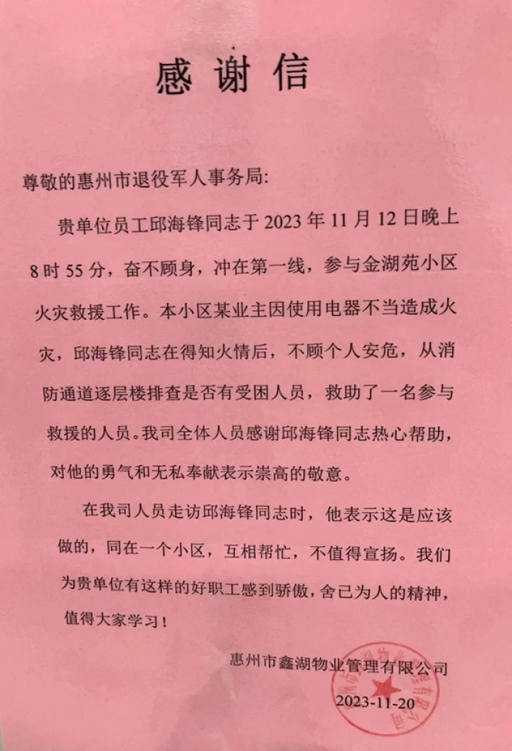 日前,一封來(lái)自小區(qū)物業(yè)的感謝信,讓惠州市退役軍人服務(wù)中心主任邱海鋒勇闖火場(chǎng)解救被困老人的事跡“藏不住了”。此前邱海鋒遇火災(zāi)逆向而行,緊急疏散鄰居,逐層搜索排查,勇闖火場(chǎng)解救被困老人,被小區(qū)業(yè)主親切稱為“新時(shí)代最美鄰居”。