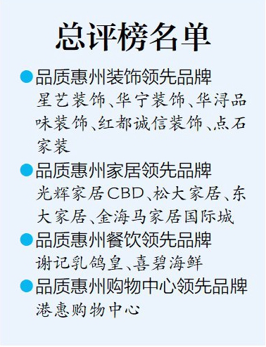 據(jù)了解,惠州總評(píng)榜作為惠州日?qǐng)?bào)社為助推商業(yè)、家居行業(yè)發(fā)展舉辦的一大盛事,評(píng)選活動(dòng)已持續(xù)開(kāi)展10多屆。一直以來(lái),總評(píng)榜始終堅(jiān)持以服務(wù)消費(fèi)者為宗旨,站在消費(fèi)者立場(chǎng),用消費(fèi)者的眼光選出值得信賴(lài)的企業(yè),備受消費(fèi)者和業(yè)內(nèi)人士認(rèn)可。