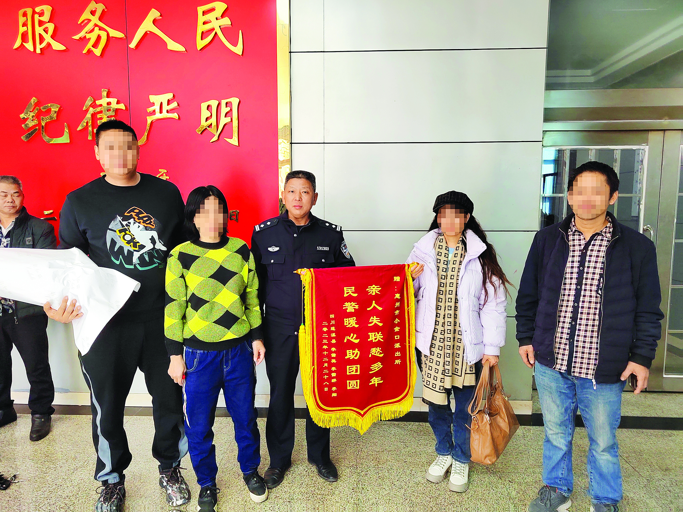 2023年12月28日,李小英、李雪、李勇和李華4人手持寫有“親人失聯(lián)愁多年,民警暖心助團(tuán)圓”的錦旗來到小金口派出所,眼含熱淚,向?yàn)槊褶k實(shí)事辦好事的公安民警鄭重地表達(dá)謝意。
