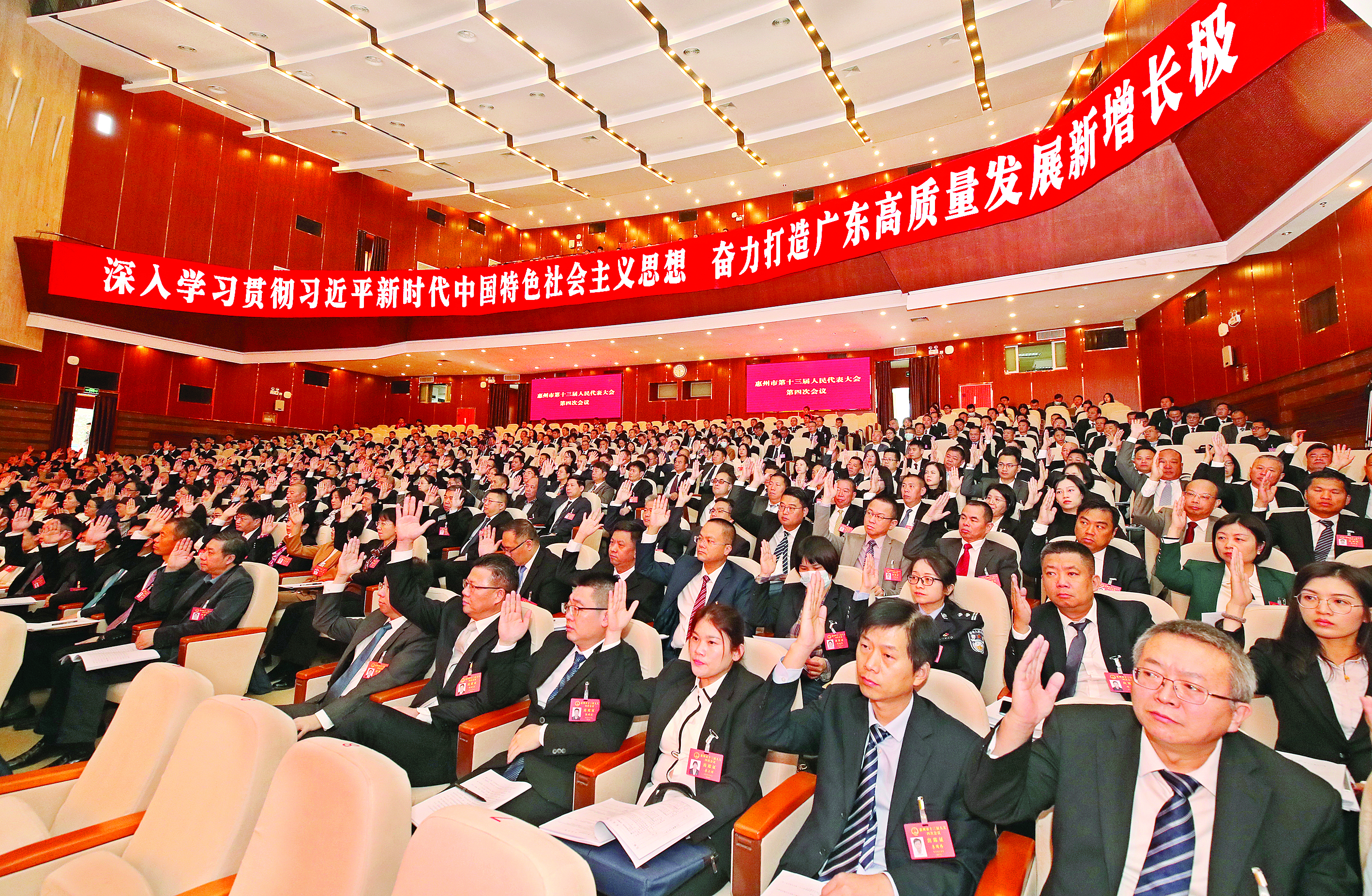 1月17日上午,惠州市十三屆人大四次會(huì)議在市會(huì)議中心開幕,市人大代表舉手通過(guò)有關(guān)決議;葜萑?qǐng)?bào)記者鐘暢新 攝