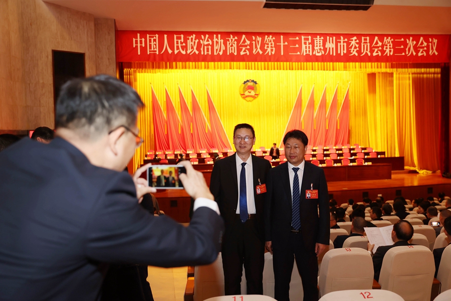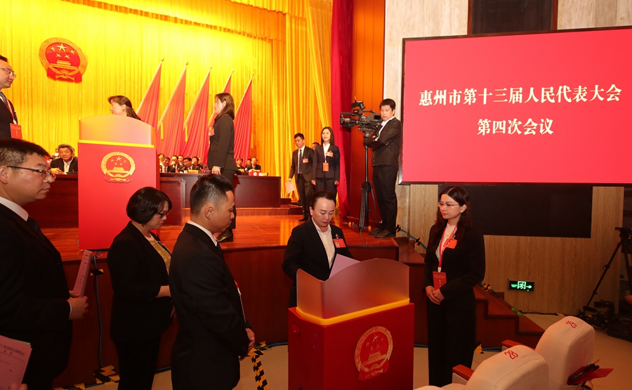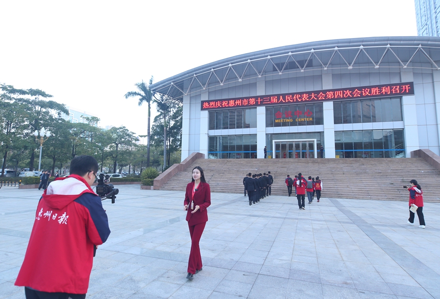 惠州日報(bào)記者出鏡報(bào)道市十三屆人大四次會(huì)議開幕。