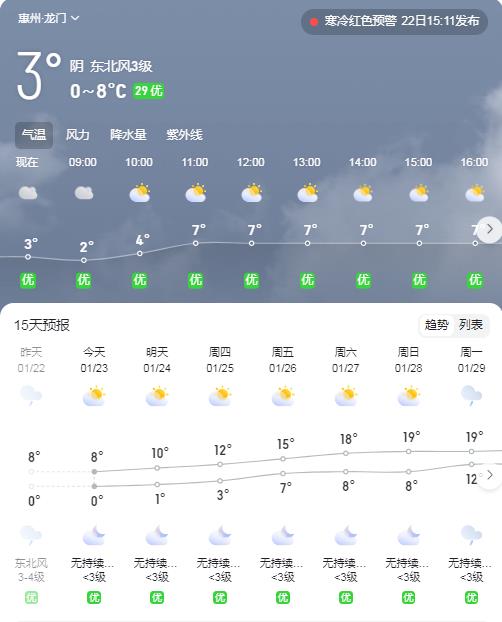 惠州日?qǐng)?bào)訊 (記者劉建威)市氣象臺(tái)預(yù)計(jì),本周前期受強(qiáng)冷空氣補(bǔ)充影響,我市氣溫下降并伴有分散小雨和大風(fēng),局部有霜(冰)凍,日平均氣溫維持在10℃以下,體感陰冷;中后期氣溫逐步回升,晝夜溫差加大。值得關(guān)注的是,預(yù)計(jì)龍門縣1月23日至24日最低氣溫降至0℃以下,并伴有霜凍和冰凍。龍門縣氣象臺(tái)于1月22日15時(shí)05分將寒冷橙色預(yù)警信號(hào)升級(jí)為紅色,提醒大家注意防寒防凍。其余縣區(qū)維持寒冷橙色預(yù)警信號(hào)。