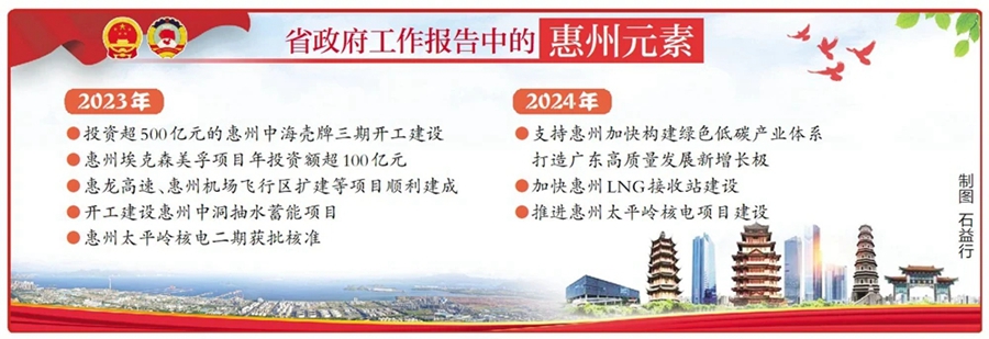 惠州中海殼牌三期、埃克森美孚、太平嶺核電二期、惠州機(jī)場飛行區(qū)擴(kuò)建、惠龍高速、中洞抽水蓄能項(xiàng)目……省十四屆人大二次會議1月23日上午開幕,惠州多個大項(xiàng)目被寫進(jìn)省政府工作報告。記者注意到,報告提出,“支持惠州加快構(gòu)建綠色低碳產(chǎn)業(yè)體系、打造廣東高質(zhì)量發(fā)展新增長極”。