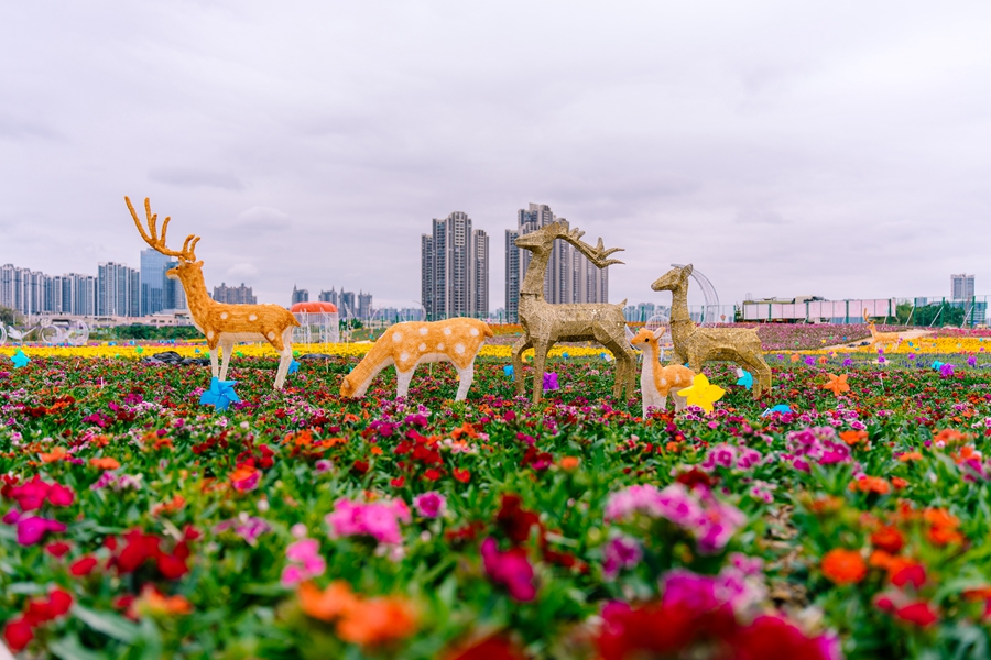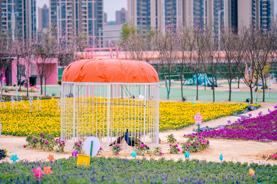 除了前所未有的賞櫻玩法,游客們還可以體驗(yàn)到五彩繽紛唯美絕倫的花海觀光。主辦方已引進(jìn)格;ā⒆仙珷颗;、一串紅、萬壽菊等近20種花卉品種,打造成萬平花海。白天百花沐浴著陽光綻放,與藍(lán)天白云融為一體。幸運(yùn)的觀眾能欣賞到孔雀在花海中開屏。到了夜晚,燦爛花海與百萬燈光秀交相輝映,隨手打卡拍照,每一幀都是大片。