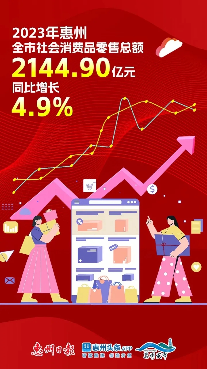 消費(fèi)方面。去年,全市社會(huì)消費(fèi)品零售總額2144.90億元,同比增長4.9%,增速比前三季度上升0.5個(gè)百分點(diǎn)。從近兩年平均值來看,惠州社會(huì)消費(fèi)品零售總額增速4%,高于全省3.7%平均增速。