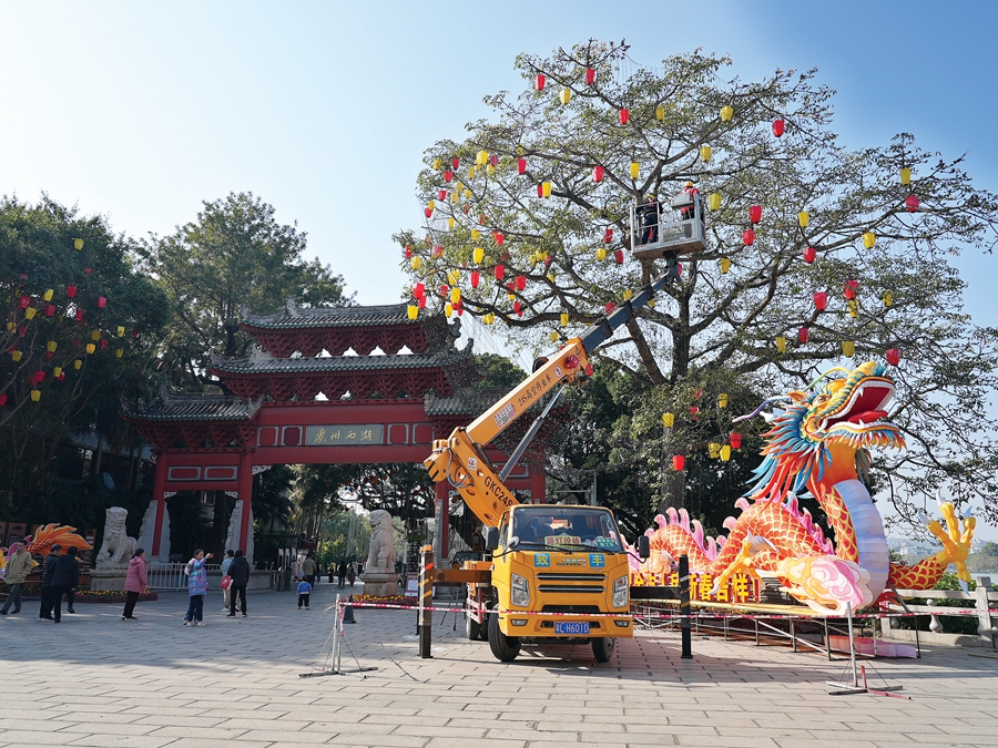 工作人員在惠州西湖景區(qū)平湖門加緊布置“祥龍賀歲”主題花燈;葜萑?qǐng)?bào)記者哈鵬 攝