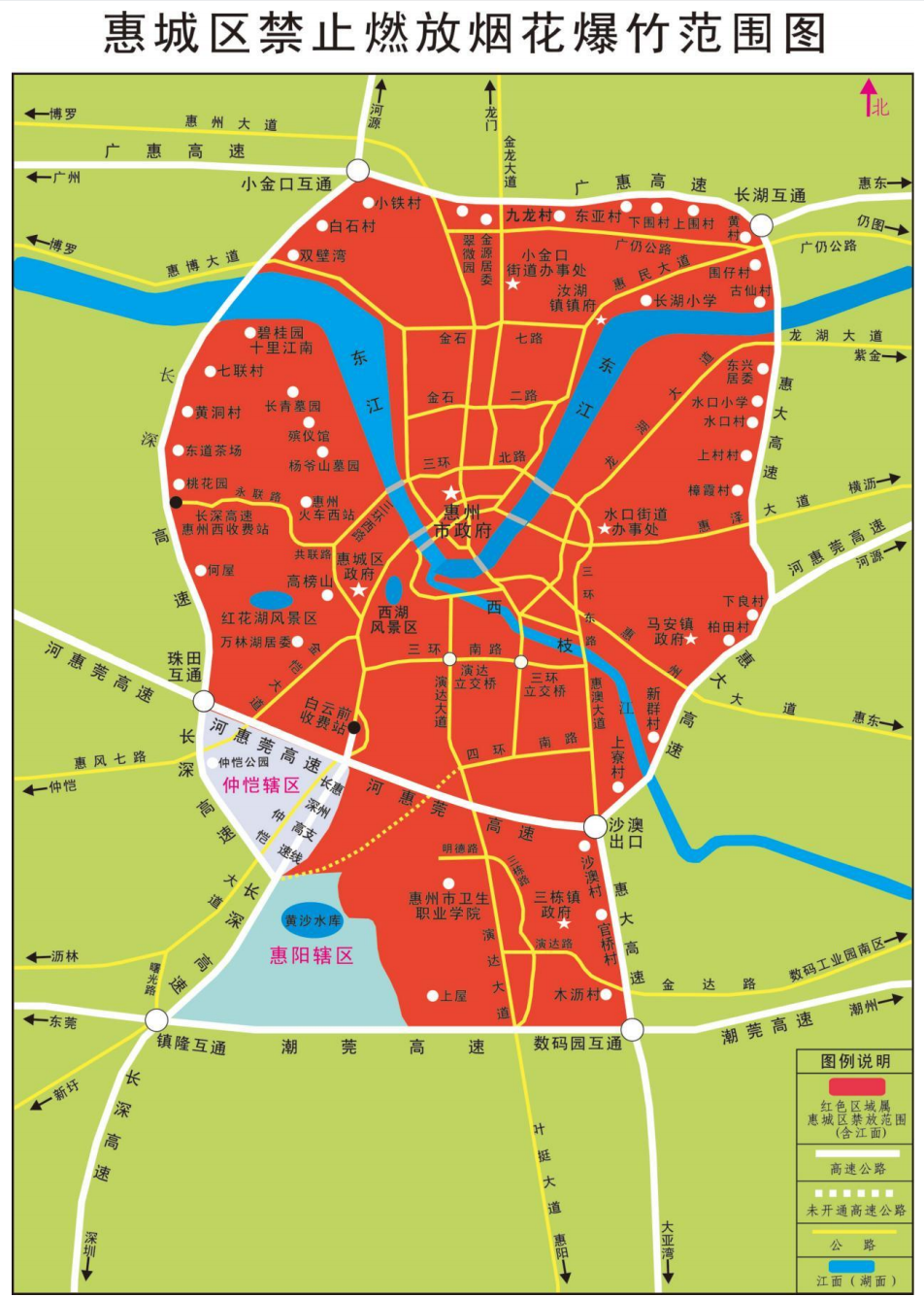 禁止燃放煙花爆竹的范圍:東起惠大高速長(zhǎng)湖互通、惠大高速,止潮莞高速數(shù)碼園互通以西方向的惠城區(qū)管轄區(qū)域(含江面);南起潮莞高速數(shù)碼園互通、潮莞高速,止長(zhǎng)深高速鎮(zhèn)隆互通以北方向的惠城區(qū)管轄區(qū)域(含江面);西起長(zhǎng)深高速鎮(zhèn)隆互通、長(zhǎng)深高速、長(zhǎng)深高速惠州支線與河惠莞高速交叉處以東方向的惠城區(qū)管轄區(qū)域,沿河惠莞高速西北行至珠田互通以北方向的惠城區(qū)管轄區(qū)域,再沿長(zhǎng)深高速北上,止廣惠高速小金口互通以東方向的惠城區(qū)管轄區(qū)域(含江面);北起廣惠高速小金口互通、廣惠高速,止惠大高速長(zhǎng)湖互通以南方向的惠城區(qū)管轄區(qū)域(含江面)。
