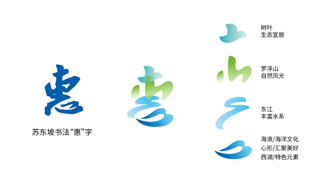 標(biāo)志整體造型由蘇東坡書(shū)法字體“惠”字創(chuàng)意變化而來(lái),將城市品牌名稱與東坡文化進(jìn)行關(guān)聯(lián),同時(shí)強(qiáng)化惠州之“惠”的美好內(nèi)涵。其中,“惠”字頭綠色部分形似樹(shù)葉,象征城市生態(tài)宜居的自然環(huán)境,中間綠色部分,形似“山”字,突出惠州以羅浮山為代表的綠色自然;左側(cè)藍(lán)色線條部分,代表蜿蜒的“東江”,也表現(xiàn)惠州是具有豐富水系的城市。下面的藍(lán)色圖案形似翻滾的海浪,代表惠州獨(dú)具特色的海洋文化,同時(shí)又象征“中國(guó)西湖三十六,惟惠州足并杭州”的惠州西湖。
