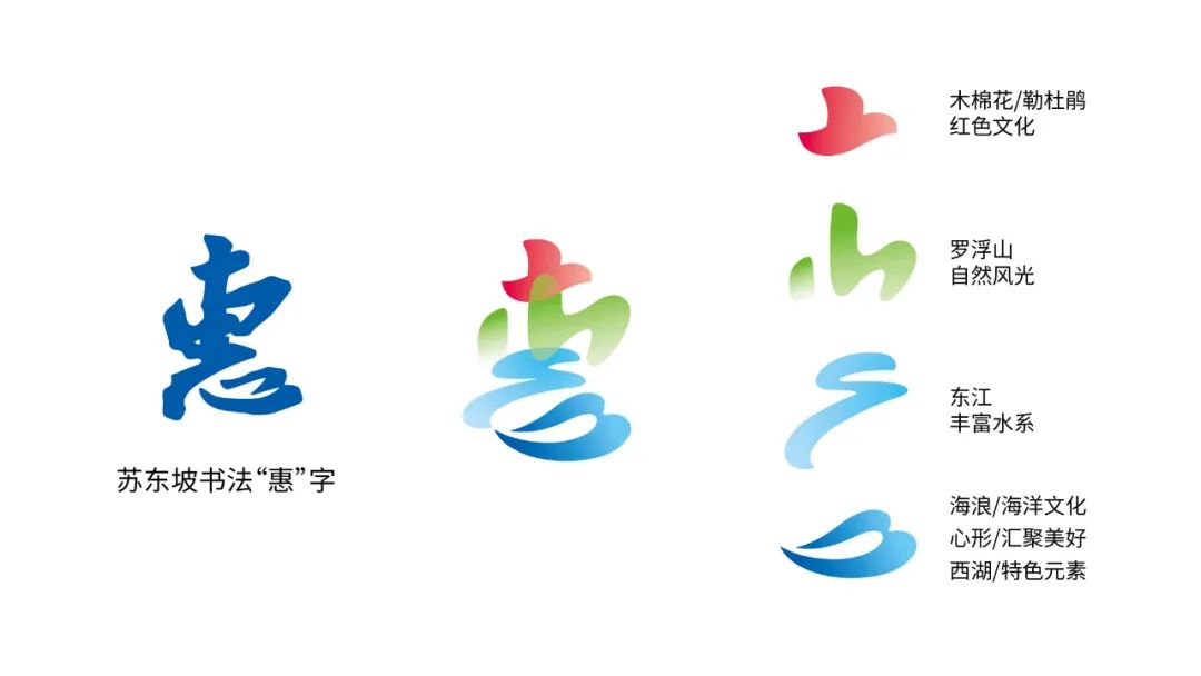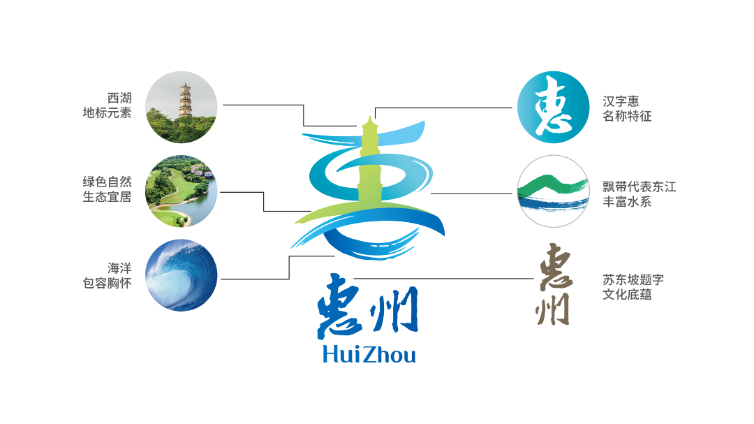 標(biāo)志整體造型由蘇東坡書(shū)法字體“惠”字創(chuàng)意變化而來(lái),將城市品牌名稱與東坡文化進(jìn)行關(guān)聯(lián),同時(shí)強(qiáng)化惠州之“惠”的美好內(nèi)涵。其中,“惠”字頭紅色部分,象征城市英雄之花木棉花,同時(shí)形似市花勒杜鵑,是城市紅色文化的體現(xiàn);中間綠色部分,形似“山”字,突出惠州以羅浮山為代表的綠色自然;左側(cè)藍(lán)色線條部分,代表蜿蜒的“東江”,也表現(xiàn)惠州是具有豐富水系的城市。下面的藍(lán)色圖案形似翻滾的海浪,代表惠州獨(dú)具特色的海洋文化。同時(shí)又象征“中國(guó)西湖三十六,惟惠州足并杭州”的惠州西湖。