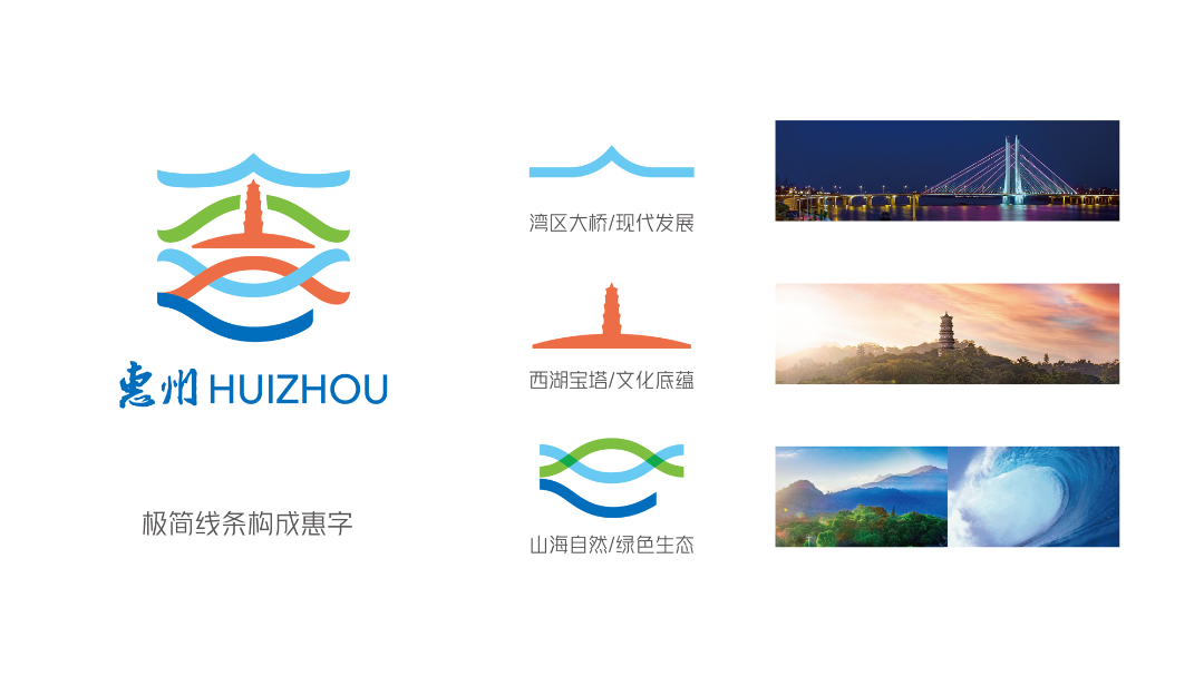 標(biāo)志用極簡(jiǎn)的線條,勾勒出惠州的“惠”字,意在引導(dǎo)受眾對(duì)“惠州”的直接聯(lián)想,同時(shí)強(qiáng)調(diào)惠州之“惠”的核心內(nèi)涵。標(biāo)志最上部藍(lán)色線條,象征灣區(qū)大橋,指向未來(lái)發(fā)展;中間橙色部分為泗洲塔,彰顯惠州歷史底蘊(yùn);泗洲塔“背后”的綠線條形似遠(yuǎn)山倒影,與泗洲塔底部象征山海自然的藍(lán)綠橙線條構(gòu)成遠(yuǎn)山近水的視覺(jué)意象。字體以東坡書(shū)法字體為藍(lán)本,突出地方特色。整體對(duì)惠州的文化氣質(zhì)、歷史底蘊(yùn)及生態(tài)優(yōu)勢(shì)進(jìn)行突出表現(xiàn)。