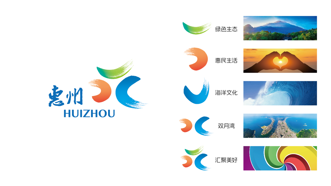 標(biāo)志整體造型由藍(lán)、綠、橙三抹寫(xiě)意的“微笑”水墨筆觸匯聚而成,構(gòu)成“惠聚美好”的品牌意象。其中,“綠色之筆”代表惠州美好的自然生態(tài);“橙色之筆”形似尚待完成的愛(ài)心,象征美好生活你我共繪;“藍(lán)色之筆”象征惠州獨(dú)具特色的海洋文化,與“橙色之筆”的組合,又形似惠州著名海灣“雙月灣”。整體上,“藍(lán)、綠、橙”三筆共同繪就了“美好惠州”視覺(jué)形象。
