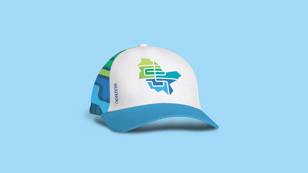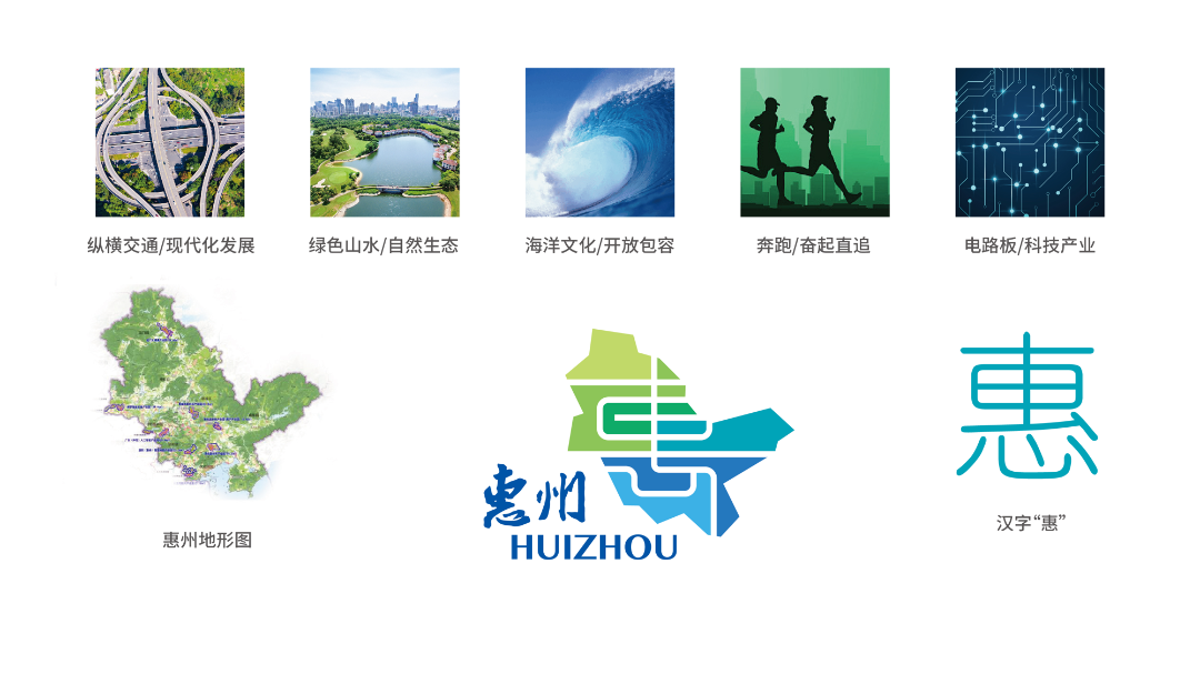 標(biāo)志整體輪廓由“惠州地圖”創(chuàng)意設(shè)計(jì)而成。地圖上勾勒出形似奔跑的“惠”字,構(gòu)成奔跑與奮起直追的視覺(jué)意象!盎荨弊志條又似城市縱橫互聯(lián)的交通體系與電路板,象征城市的現(xiàn)代發(fā)展與科技產(chǎn)業(yè)。整體造型頗具動(dòng)感,表達(dá)惠州向上向好、奔向未來(lái)的發(fā)展態(tài)勢(shì)。標(biāo)志色彩則以藍(lán)、綠為主,象征綠色山水的自然生態(tài)與開(kāi)放包容的海洋文化。