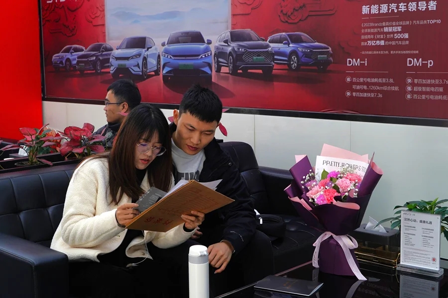 “春節(jié)前是傳統(tǒng)銷(xiāo)售旺季,廠商促銷(xiāo)力度大,疊加汽車(chē)金融的推廣,不少剛需市民都會(huì)選擇在這時(shí)出手,開(kāi)新車(chē)回家過(guò)年!北葋喌贤醭W(wǎng)惠州惠迪4S店市場(chǎng)總監(jiān)張景龍表示,比亞迪廠商在春節(jié)前推出購(gòu)車(chē)補(bǔ)貼優(yōu)惠,最高補(bǔ)貼3萬(wàn)多元,2024年1月份店賣(mài)出了100多輛車(chē),其中混動(dòng)車(chē)型和純電車(chē)型銷(xiāo)量占比各一半。