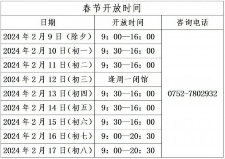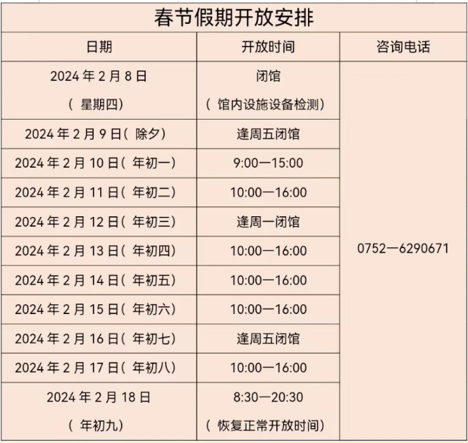根據(jù)《國務(wù)院辦公廳關(guān)于2024年部分節(jié)假日安排的通知》,結(jié)合工作實際,惠州科技館春節(jié)期間開館時間如下: