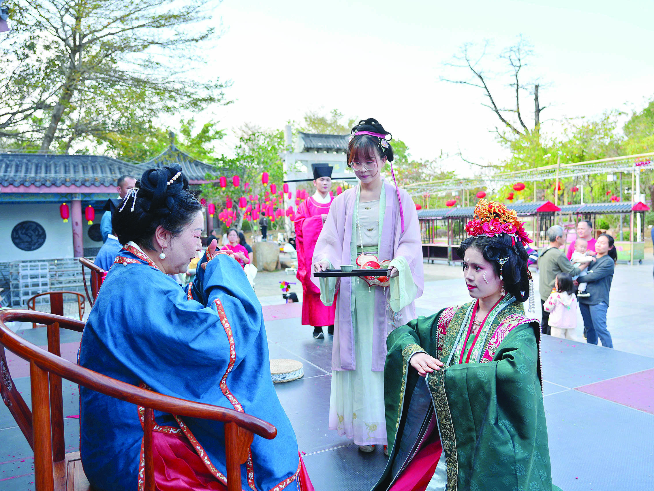 除了傳統(tǒng)工藝和美食,活動期間,你還可以在休閑中享受到一場場視覺盛宴。在蓬廬前面的臺階外,將搭建10米長、5米寬的舞臺,舞臺上午用于宋式婚禮秀(正月初六婚禮秀活動下午進行),下午將有舞蹈、演唱、傳統(tǒng)樂器演奏、山歌、粵曲等節(jié)目演出。在樂群堂和豐湖書院門口位置,每天下午和晚上還會有專業(yè)人員以快閃方式進行古樂演奏(宋式),讓你大飽眼福。