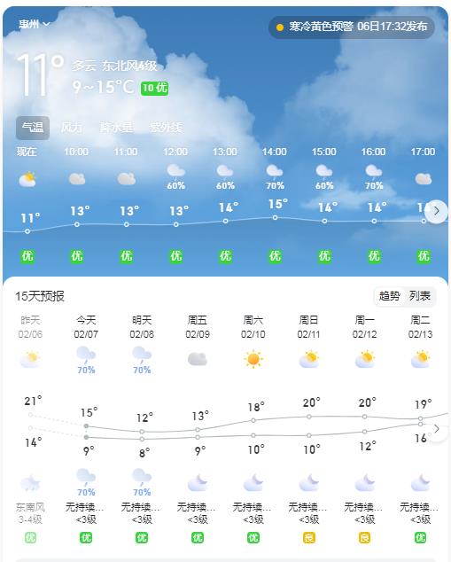 惠州日報訊 (記者劉建威)惠州市氣象臺2月6日17時28分發(fā)布惠城、仲愷和大亞灣寒冷黃色預(yù)警信號,提醒大家注意做好各項防寒保暖措施。記者獲悉,龍門、博羅、惠陽、惠東相繼發(fā)布寒冷黃色預(yù)警信號。